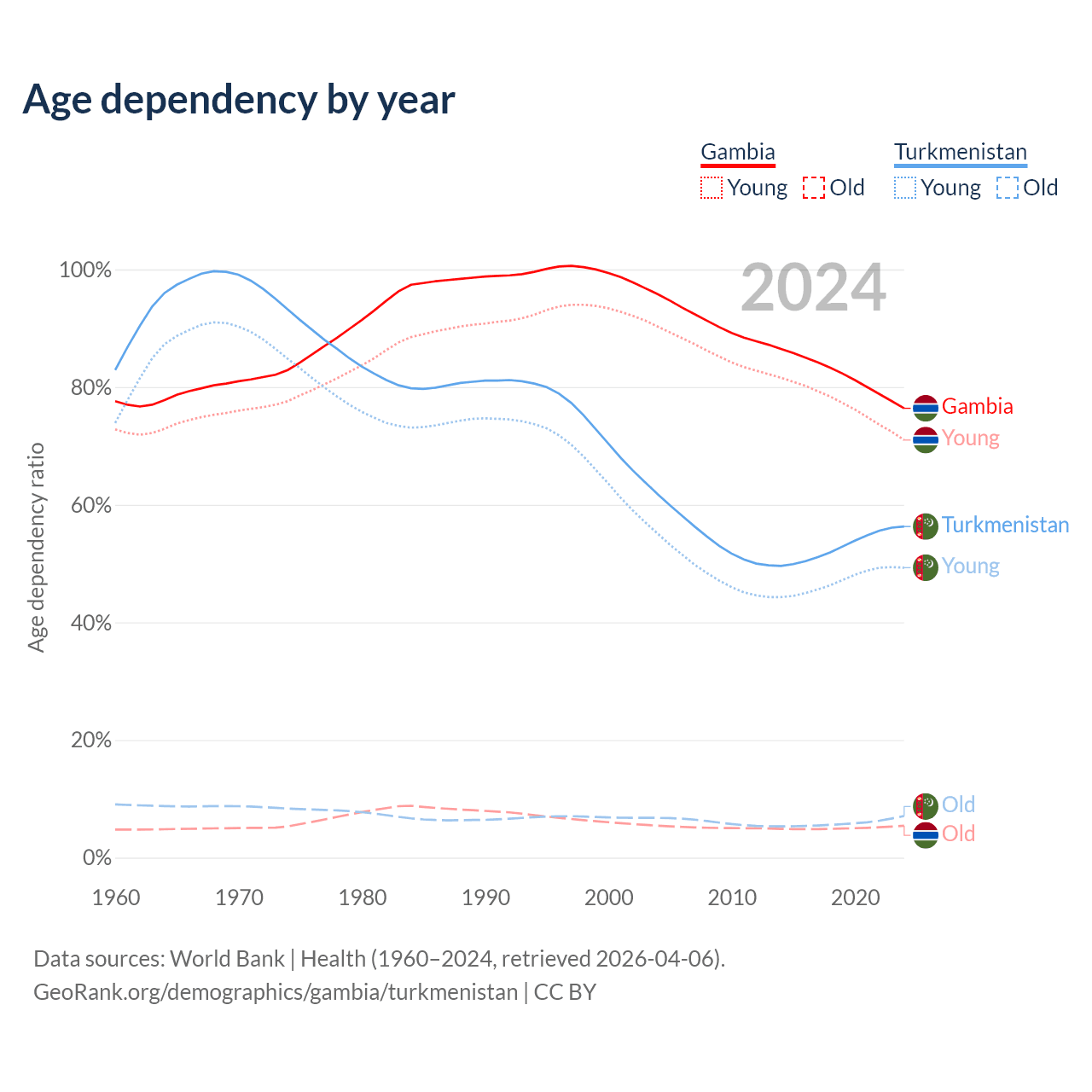 - The Gambia is ranked 171/196 by median age (oldest to youngest) vs 119/196 for Turkmenistan.
