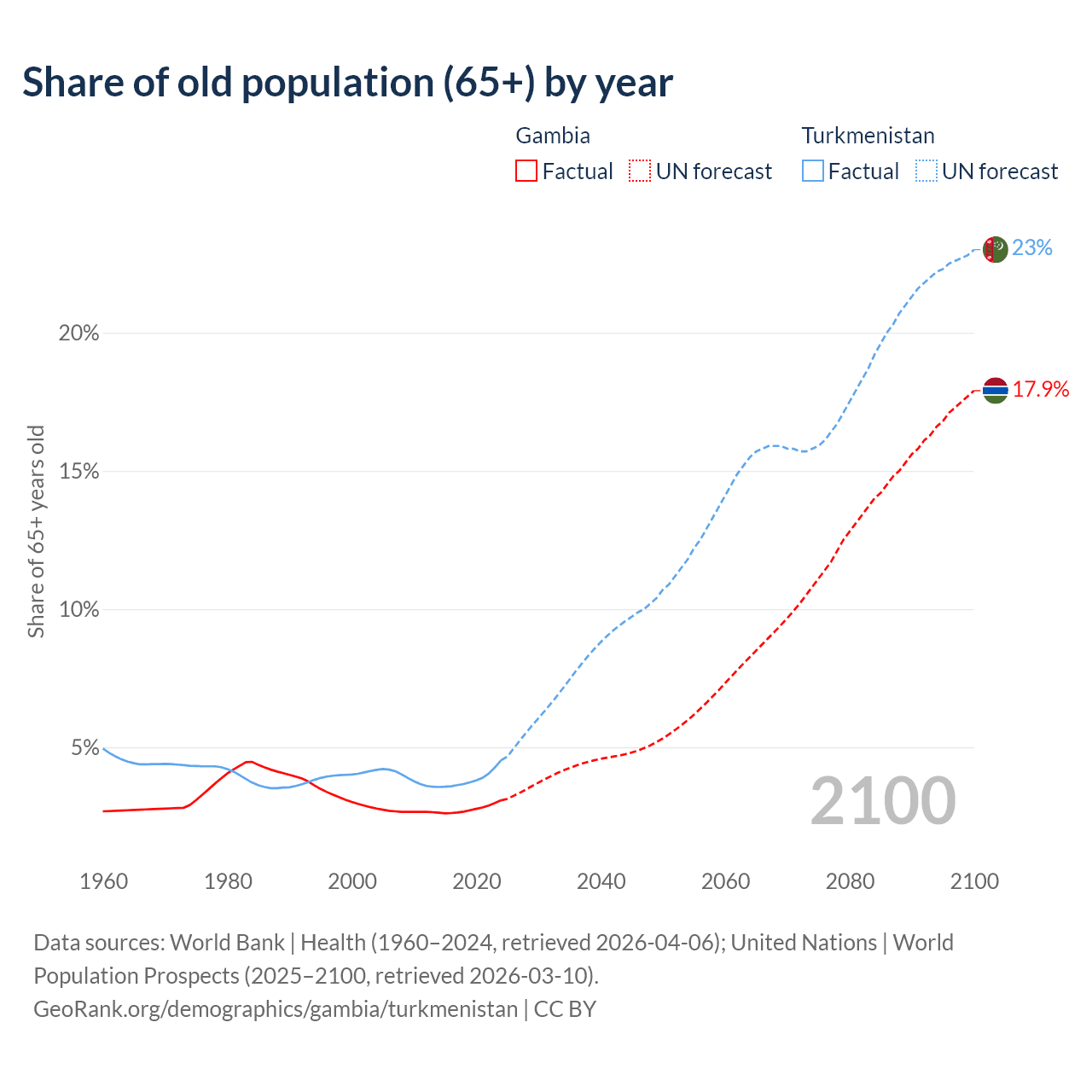 The share of older people aged 65 and over is 3.08% in the Gambia and 4.53% in Turkmenistan. Life expectancy in the Gambia compared to Turkmenistan .