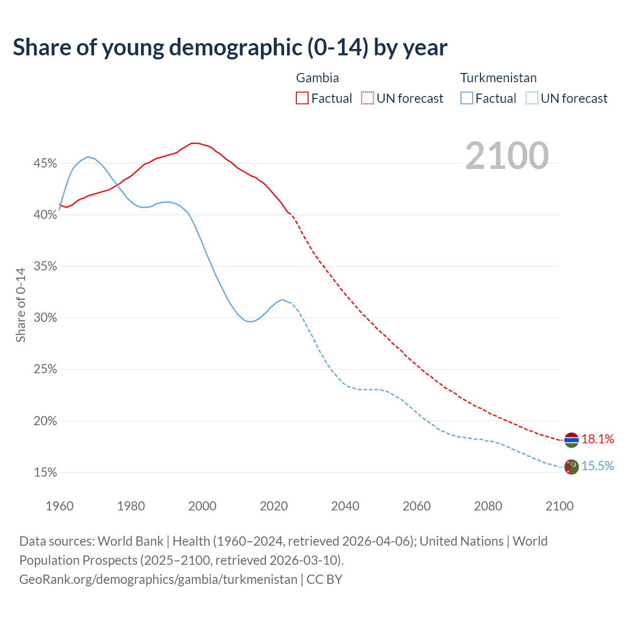 - The share of young demographic (0-15 years old) in the Gambia is 40.2% vs 31.5% in Turkmenistan.
