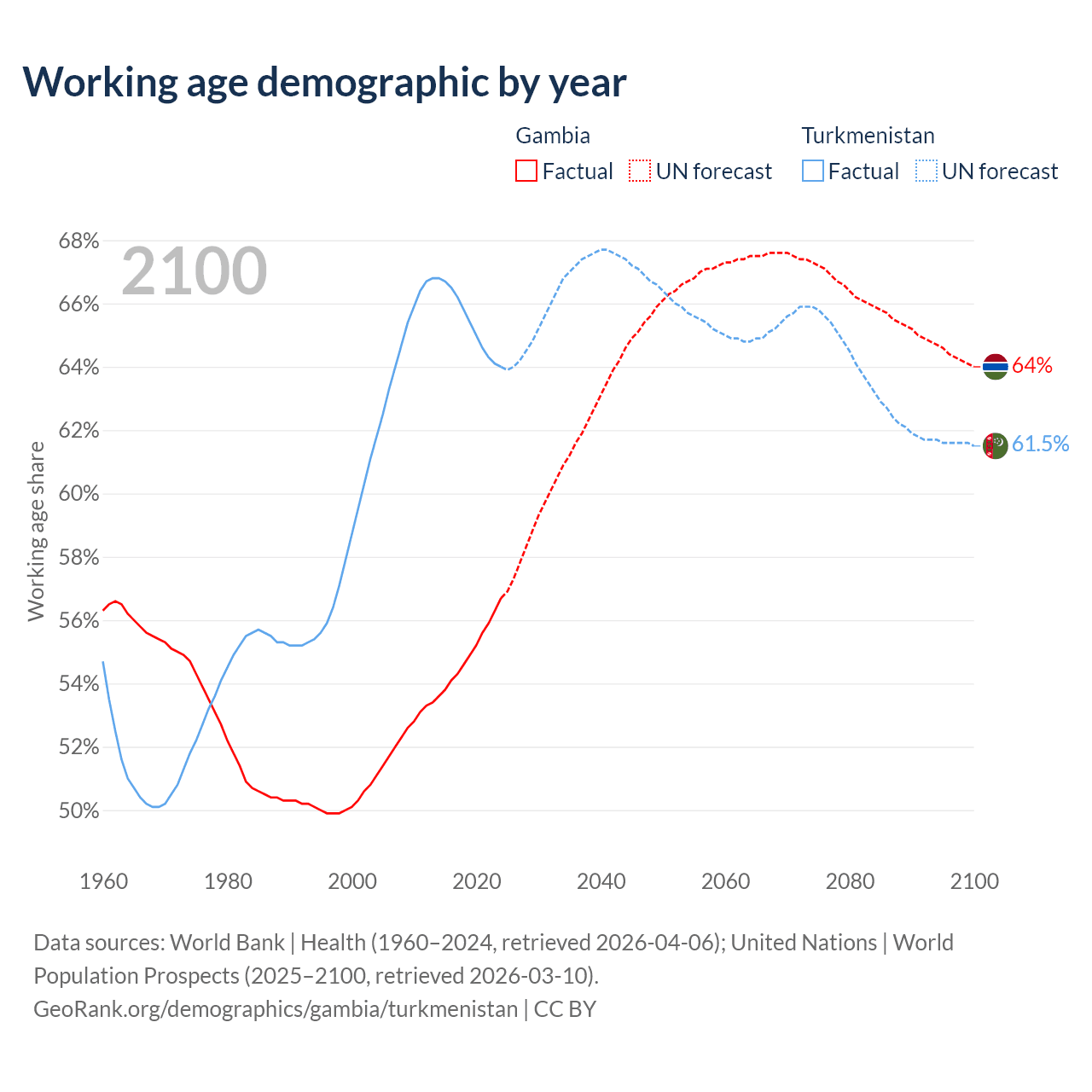 - The Gambia has 1.64M working age adults (aged 15-64) vs 4.97M in Turkmenistan.
