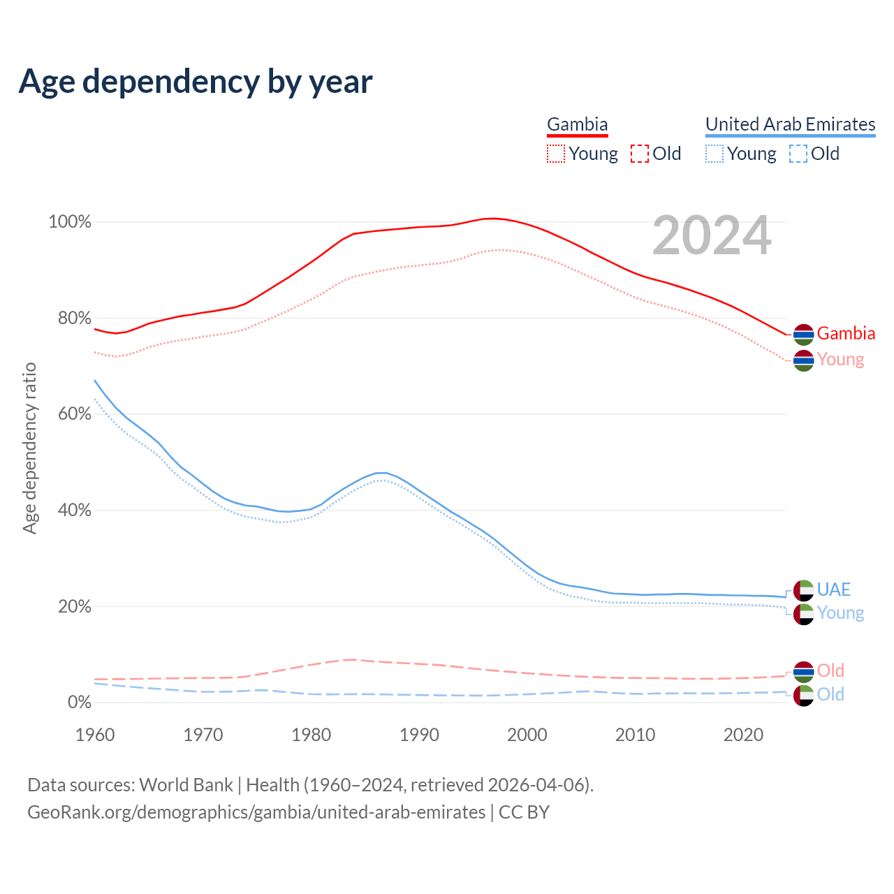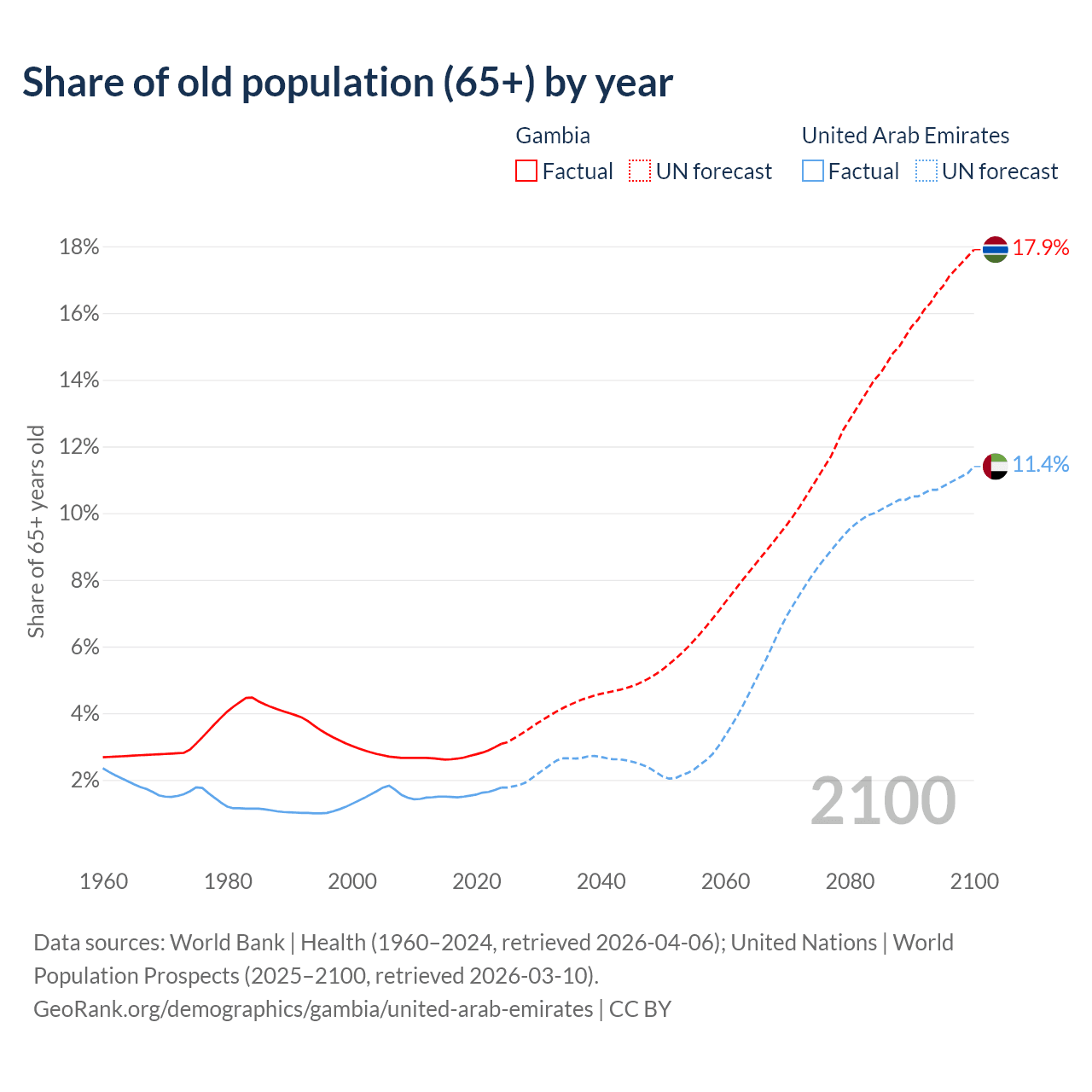 - The share of old-age demographic (65+) in the Gambia is 3.08% vs 1.77% in the United Arab Emirates.