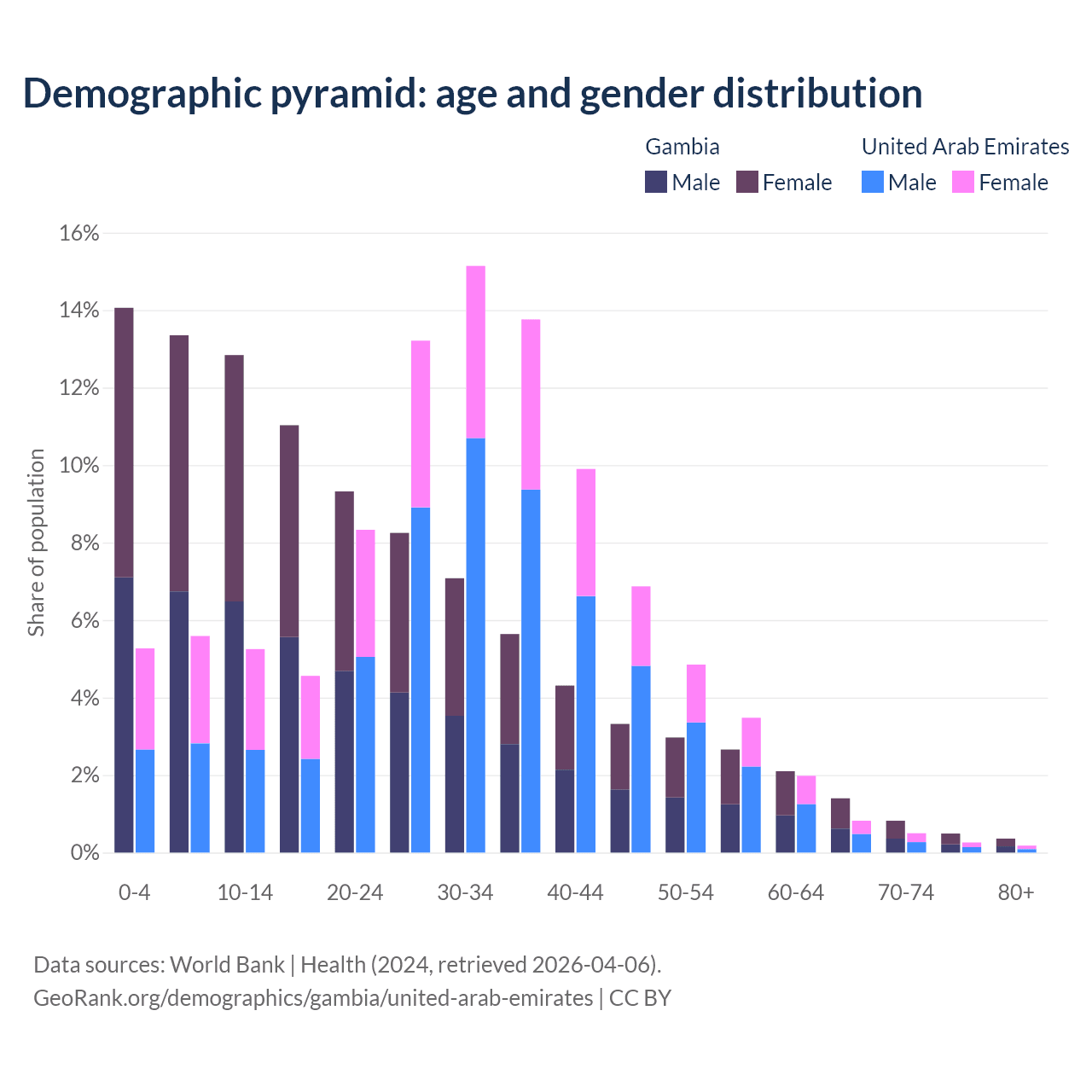 - The Gambia is ranked 171/196 by median age (oldest to youngest) vs 91/196 for the United Arab Emirates.