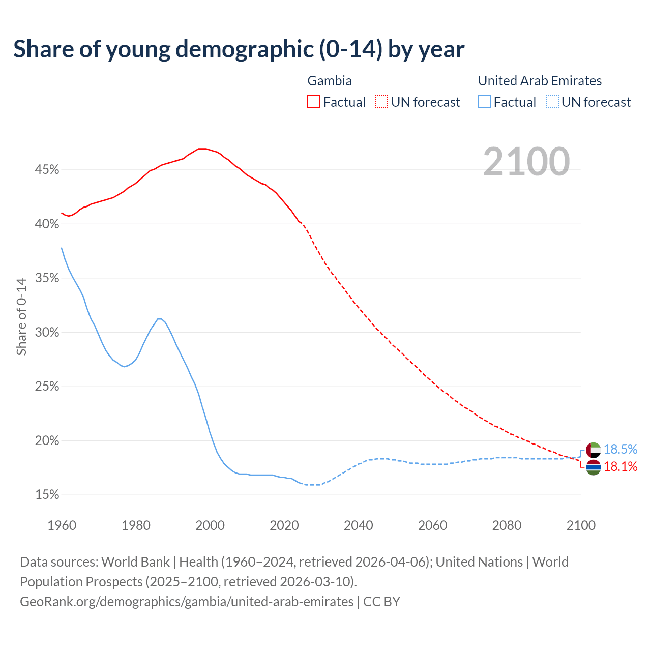 - The share of young demographic (0-15 years old) in the Gambia is 40.2% vs 16.1% in the United Arab Emirates.