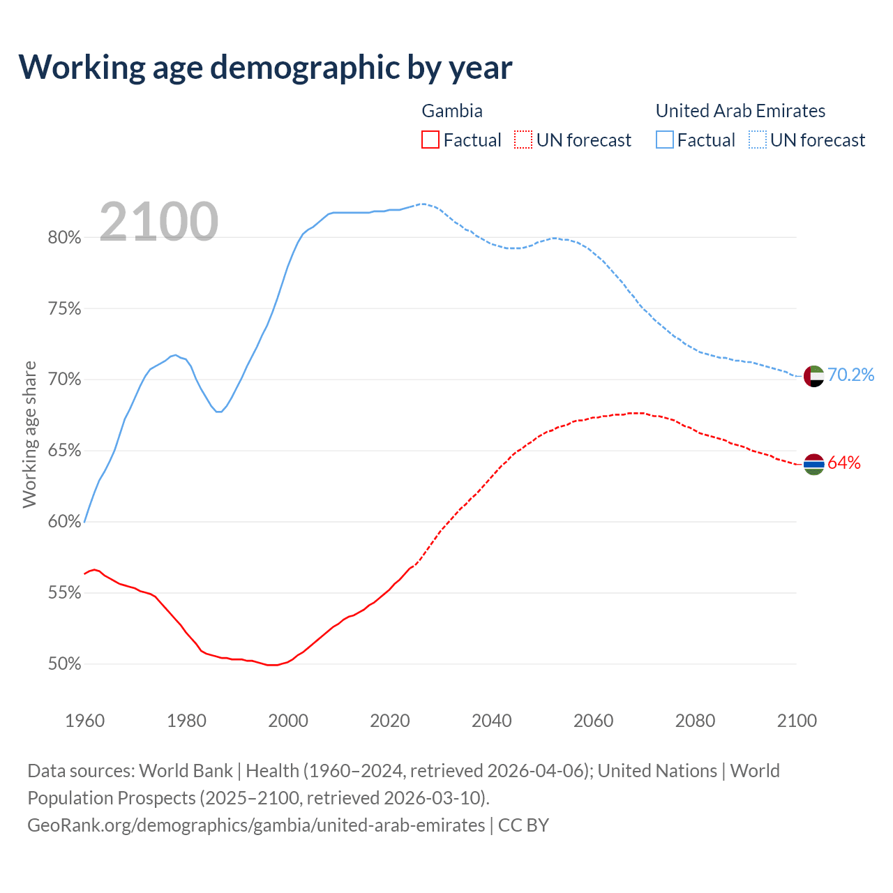 - The Gambia has 1.64M working age adults (aged 15-64) vs 9.6M in the United Arab Emirates.