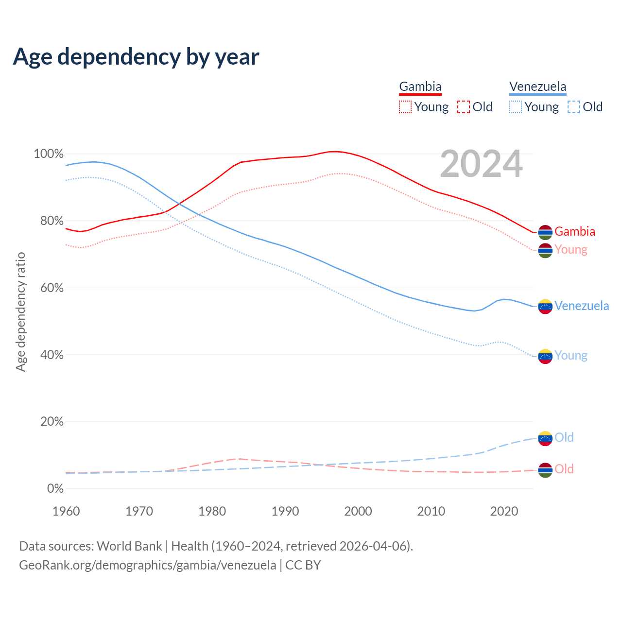 - The Gambia is ranked 171/196 by median age (oldest to youngest) vs 104/196 for Venezuela.