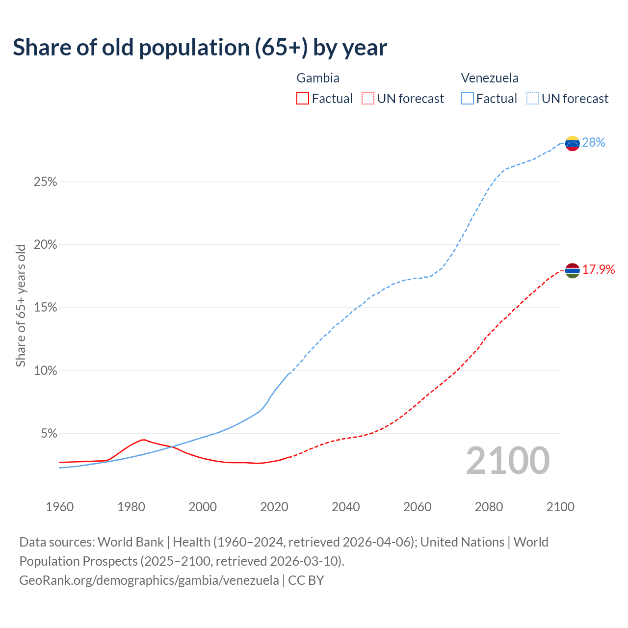 The share of older people aged 65 and over is 3.08% in the Gambia and 9.68% in Venezuela. Life expectancy in the Gambia compared to Venezuela .