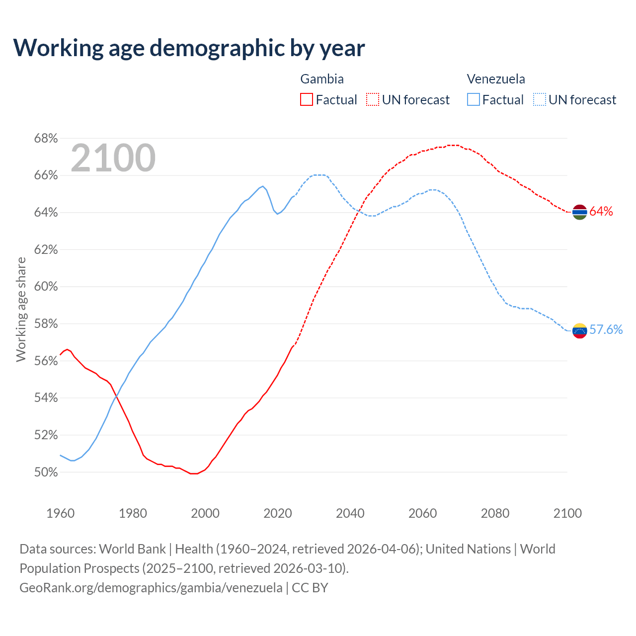 - The Gambia has 1.64M working age adults (aged 15-64) vs 18.6M in Venezuela.