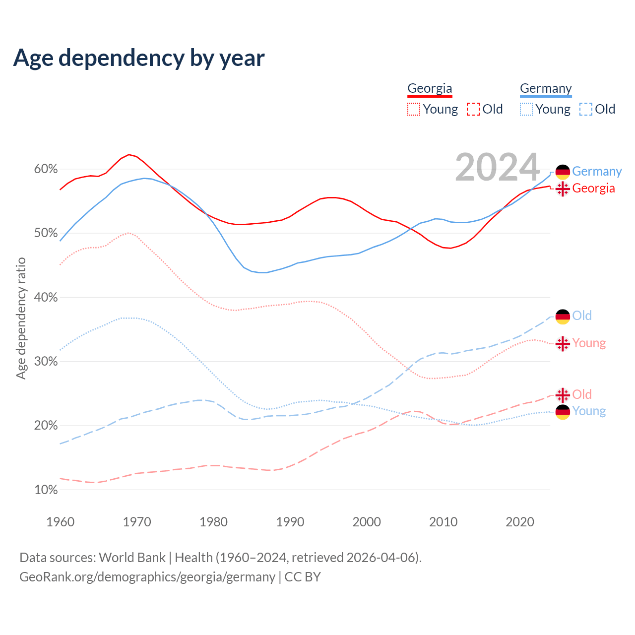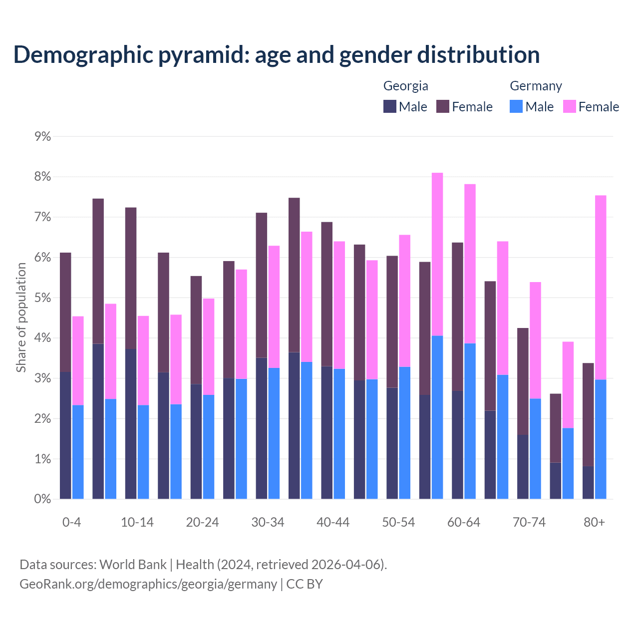 - Georgia is ranked 59/196 by median age (oldest to youngest) vs 9/196 for Germany.