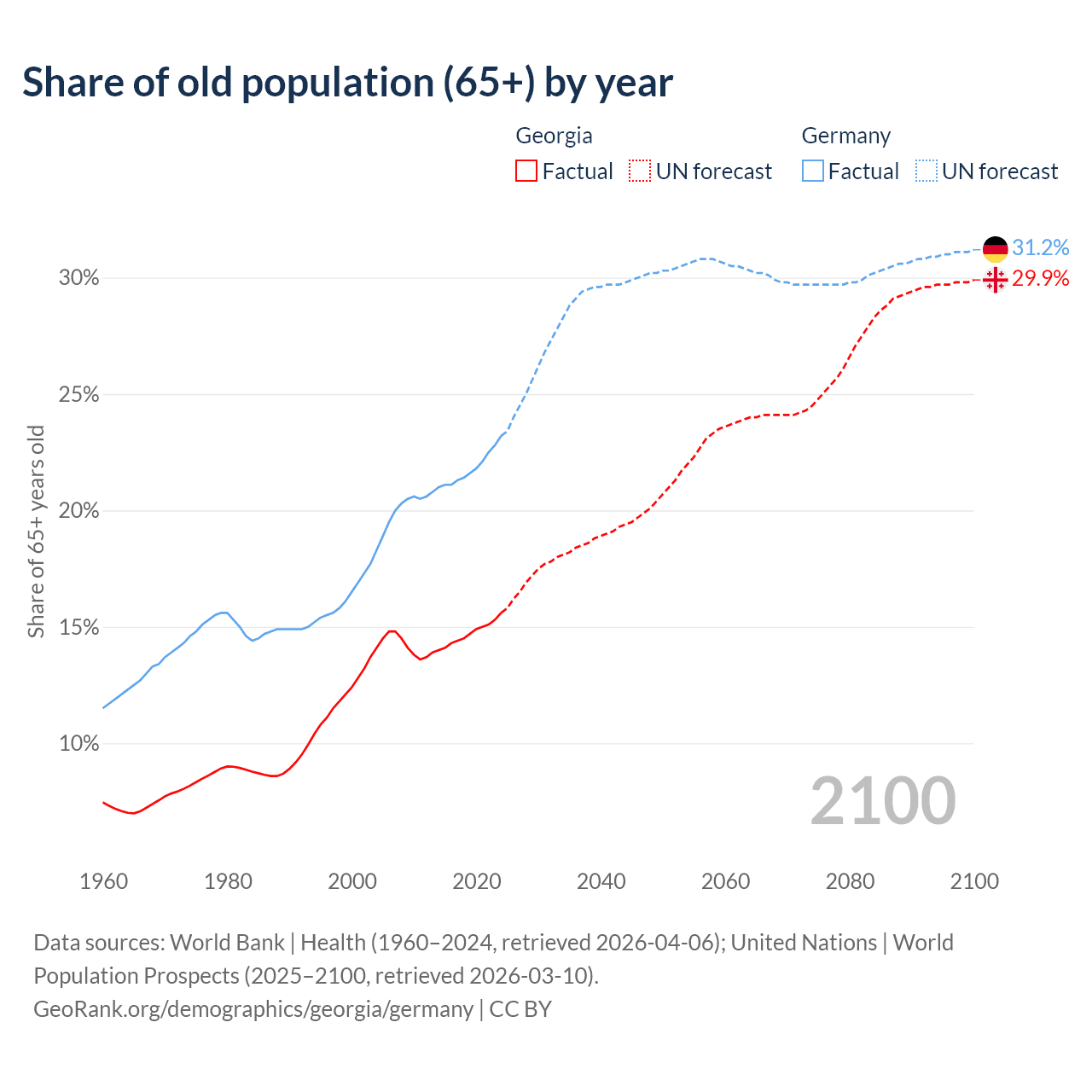 The share of older people aged 65 and over is 15.6% in Georgia and 23.2% in Germany. Life expectancy in Georgia compared to Germany .