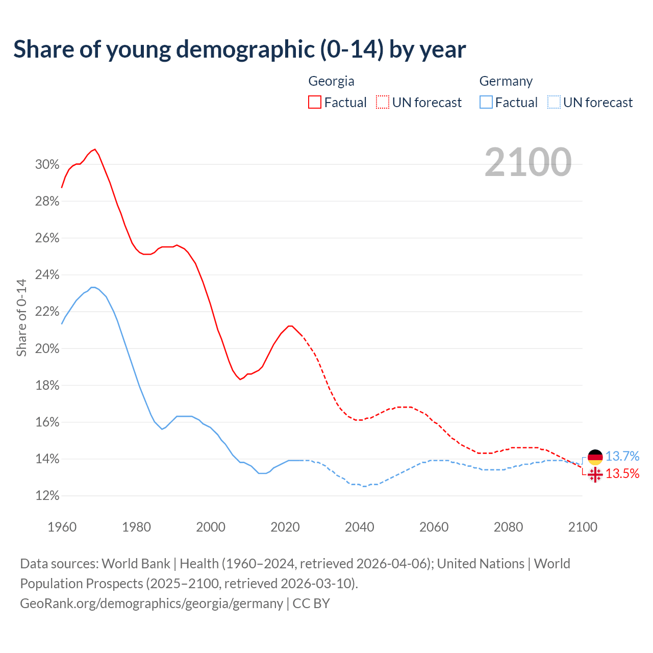 - The share of young demographic (0-15 years old) in Georgia is 20.8% vs 13.9% in Germany.