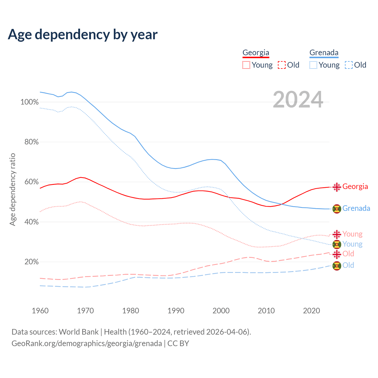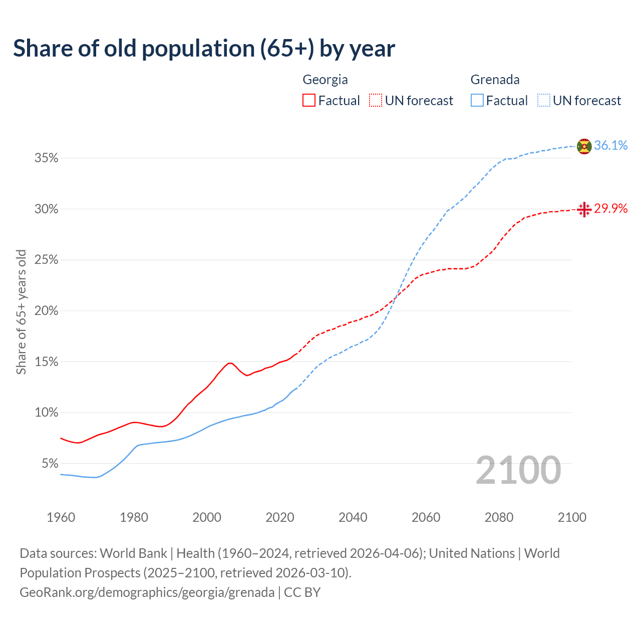- The share of old-age demographic (65+) in Georgia is 15.6% vs 12.2% in Grenada.