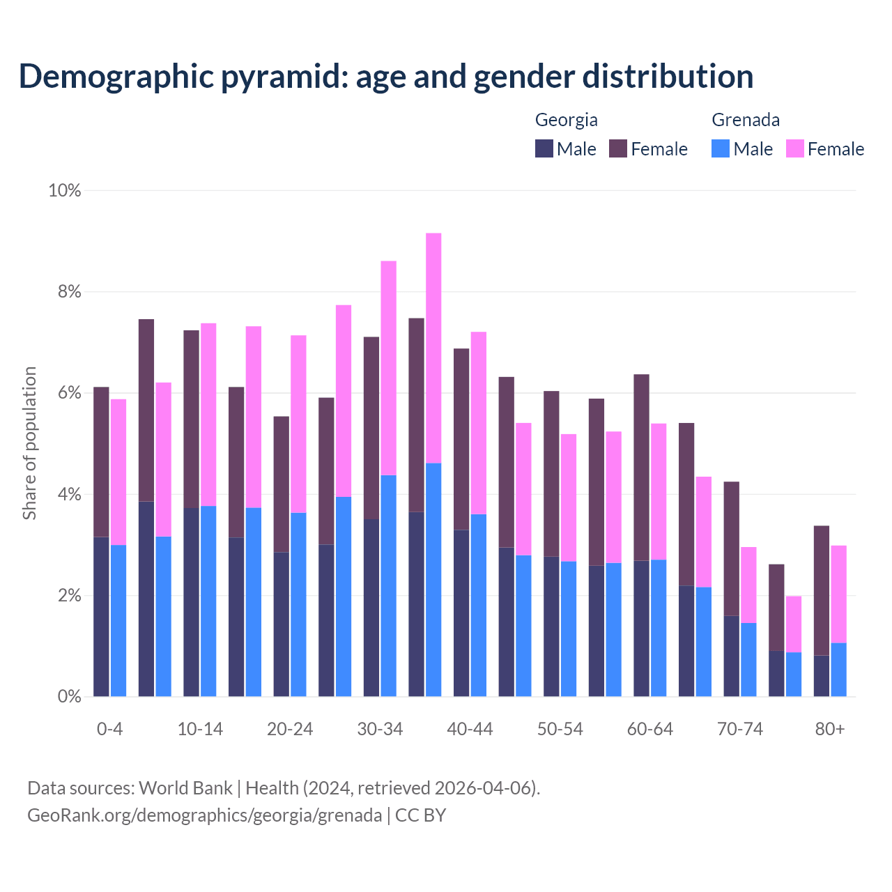- As of 2026, the population of Georgia is 3.7M vs 117K in Grenada - 31.5 times difference.