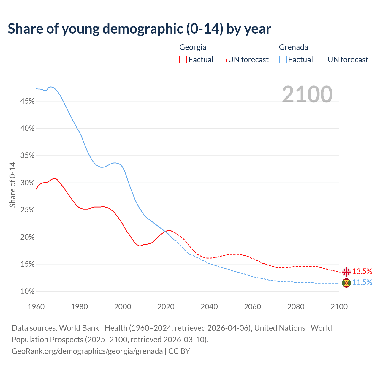 - The share of young demographic (0-15 years old) in Georgia is 20.8% vs 19.4% in Grenada.