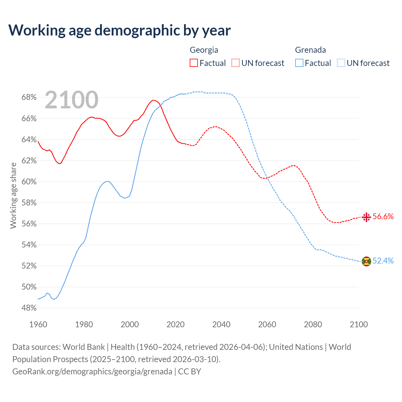 - Georgia has 2.35M working age adults (aged 15-64) vs 80.2K in Grenada.