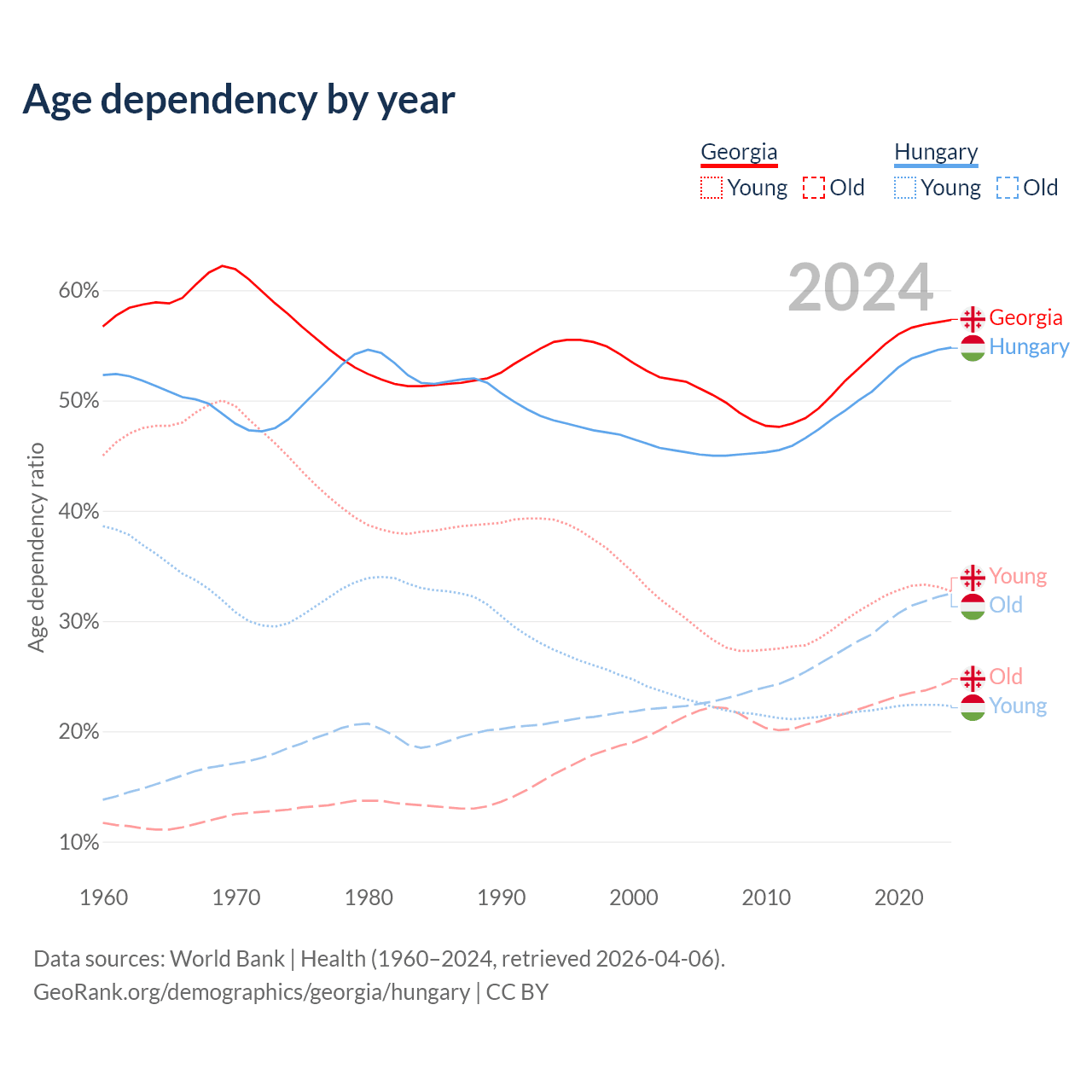 - Georgia is ranked 59/196 by median age (oldest to youngest) vs 17/196 for Hungary.