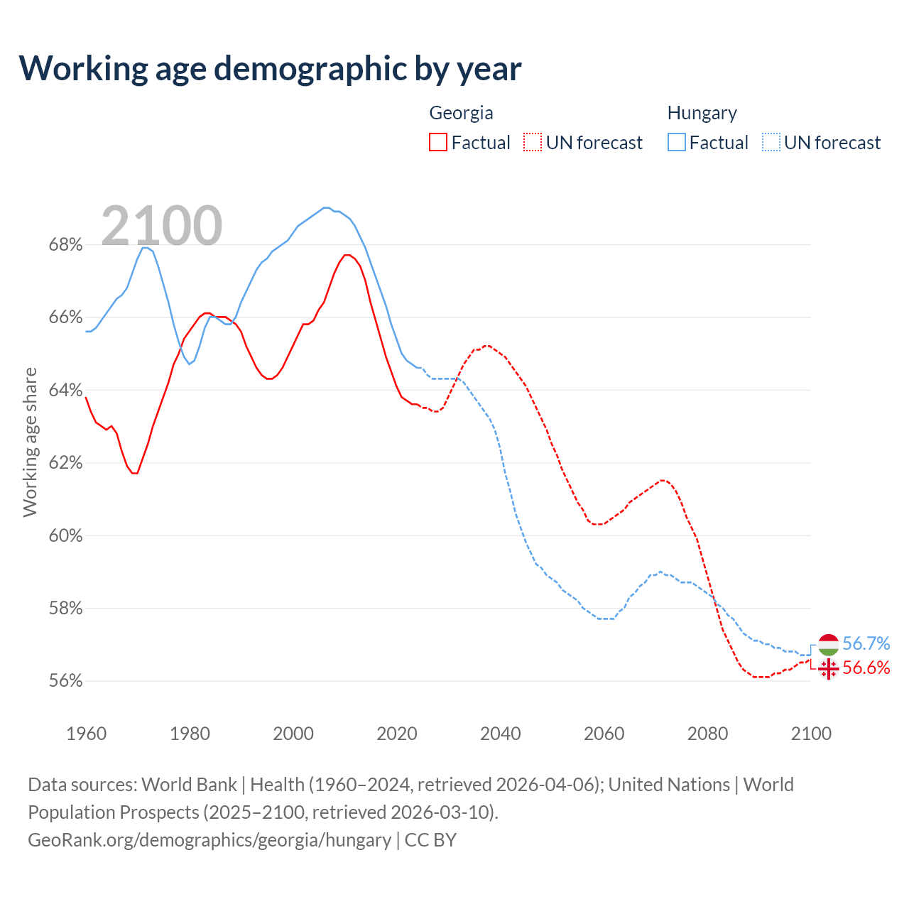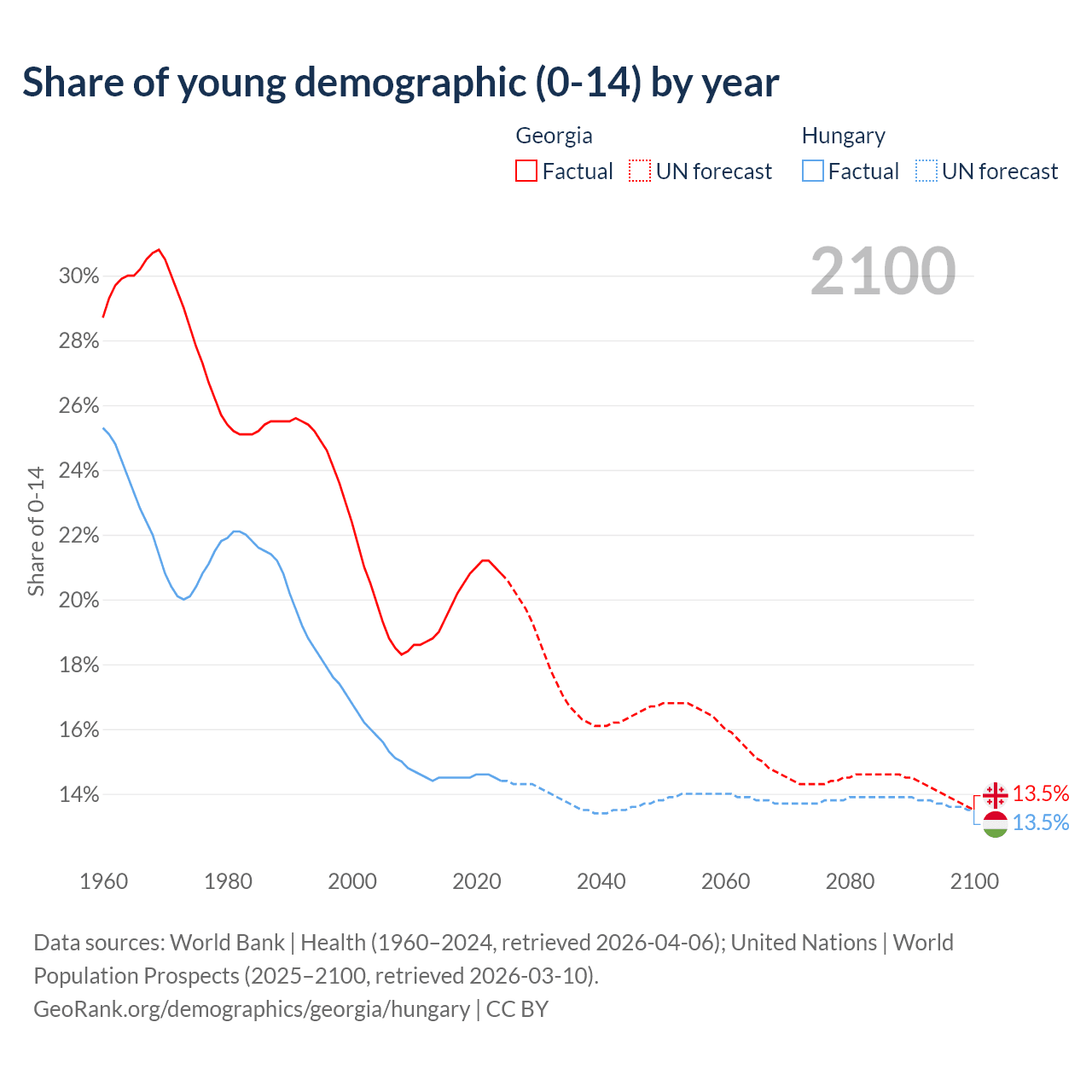 Median age Georgia vs Hungary, 1960-2100