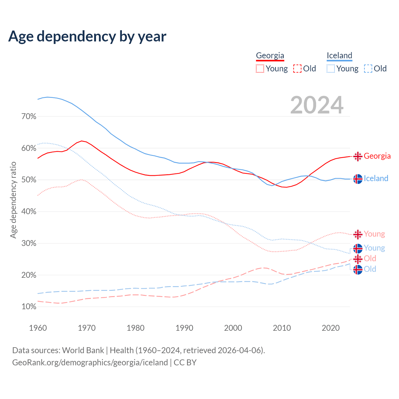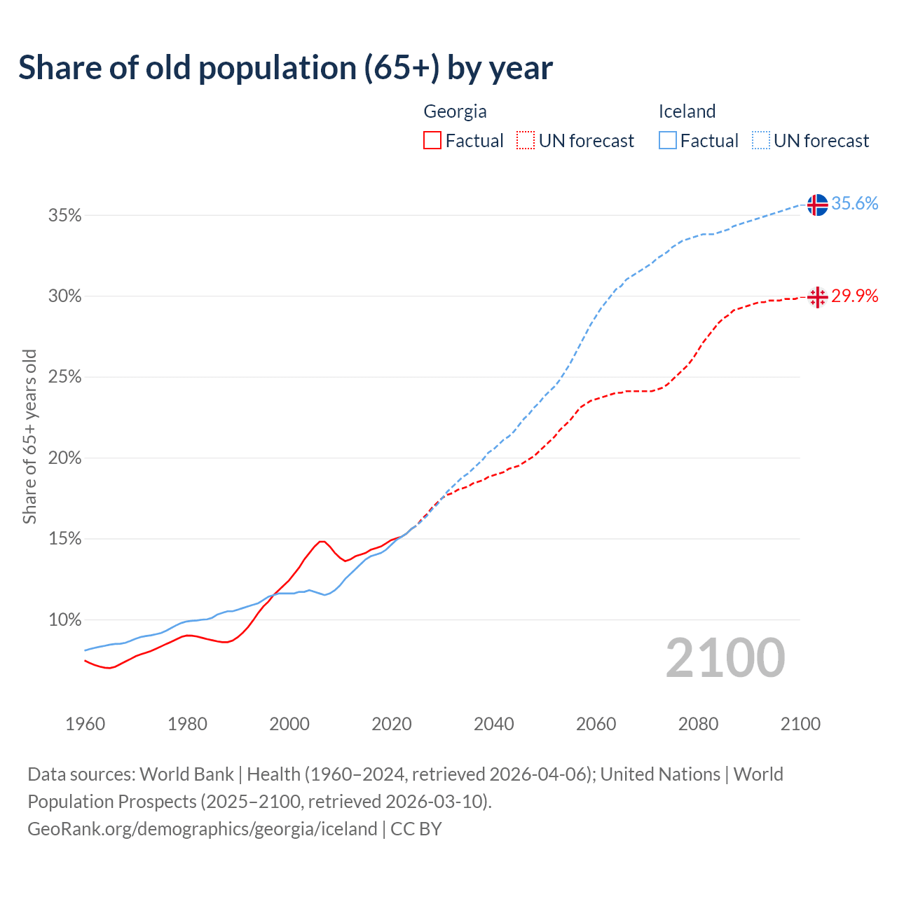 - The share of old-age demographic (65+) in Georgia is 15.6% vs 15.6% in Iceland.