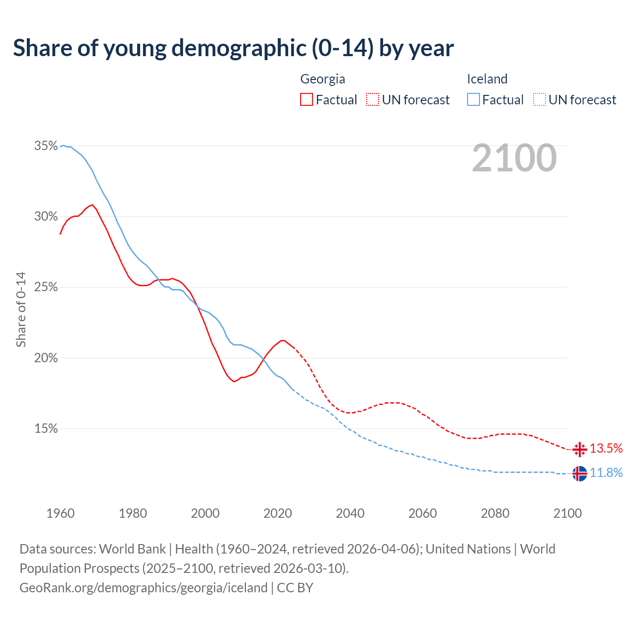- The share of young demographic (0-15 years old) in Georgia is 20.8% vs 17.8% in Iceland.