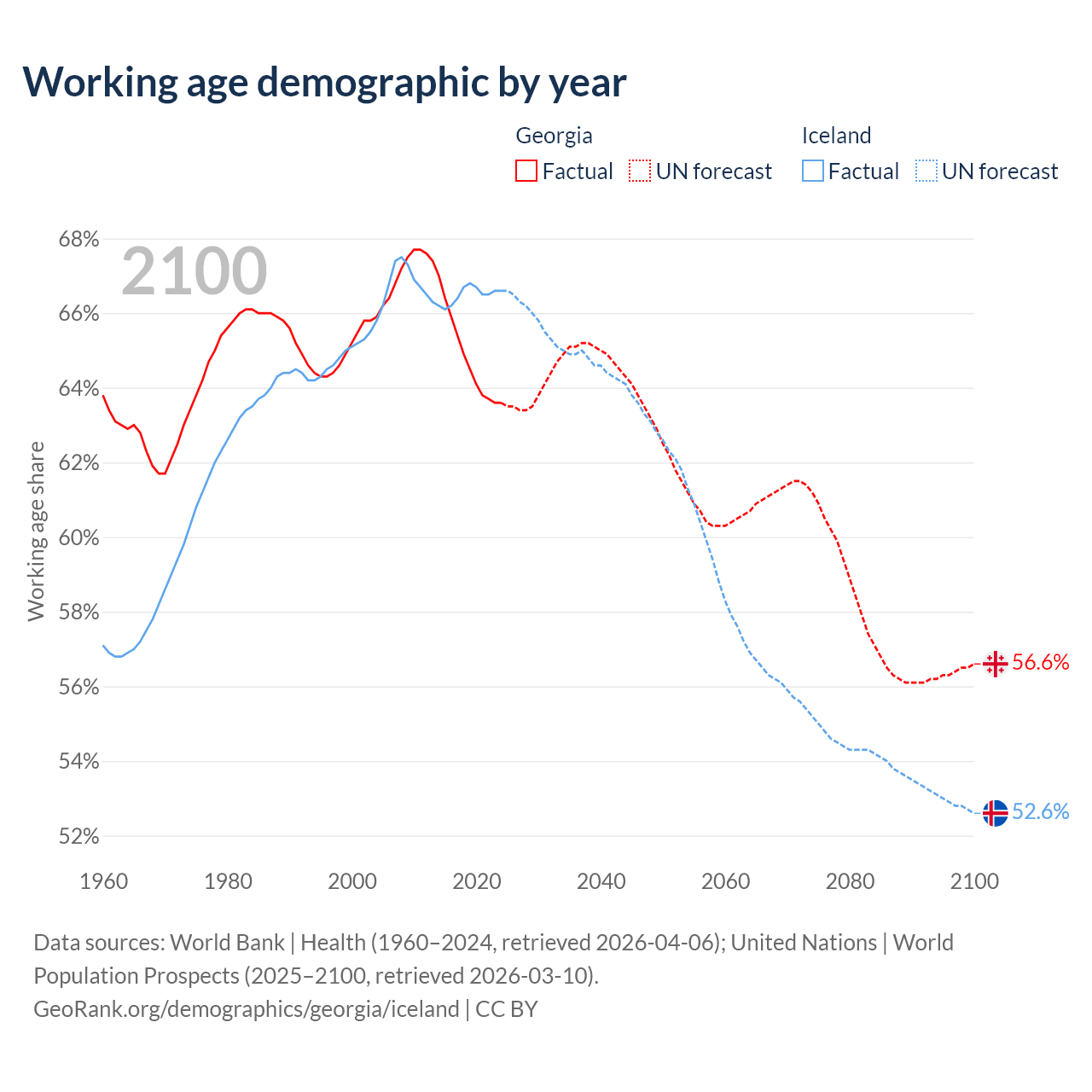 Median age Georgia vs Iceland, 1960-2100