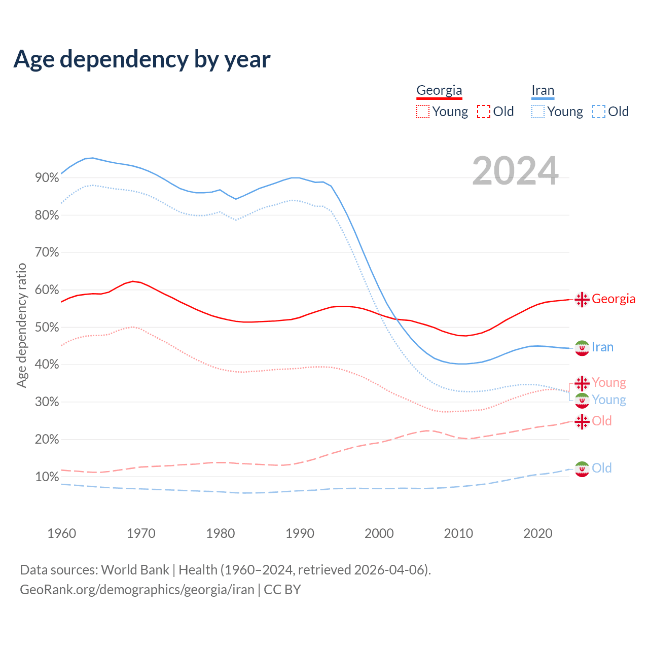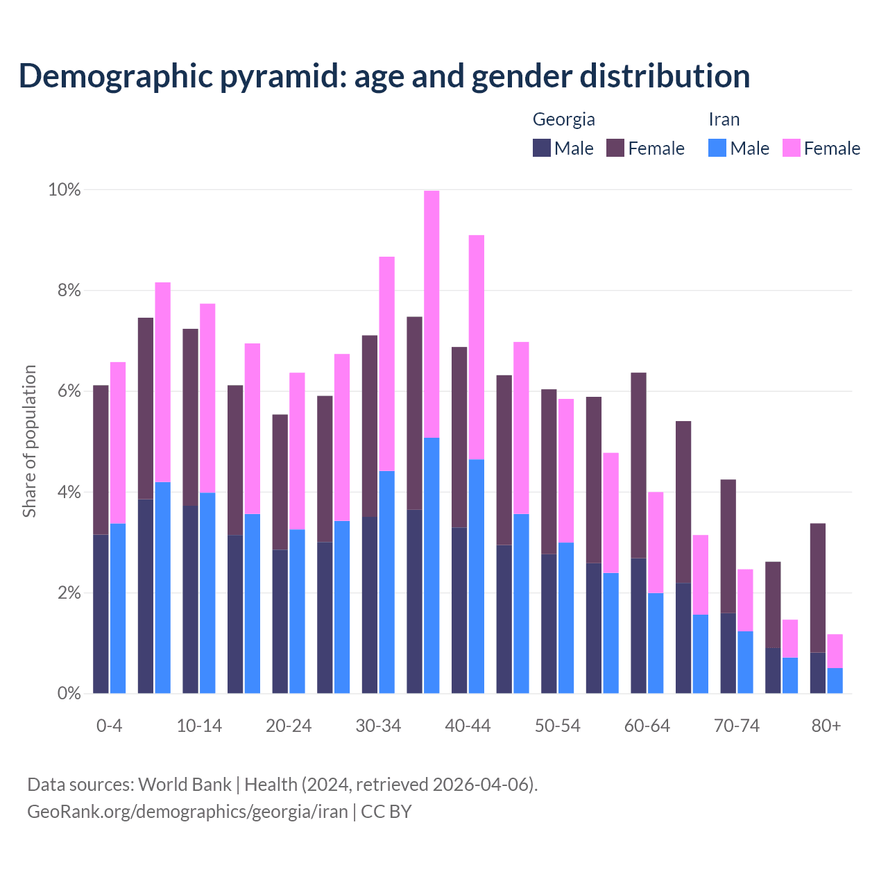 - Georgia is ranked 59/196 by median age (oldest to youngest) vs 79/196 for Iran.
