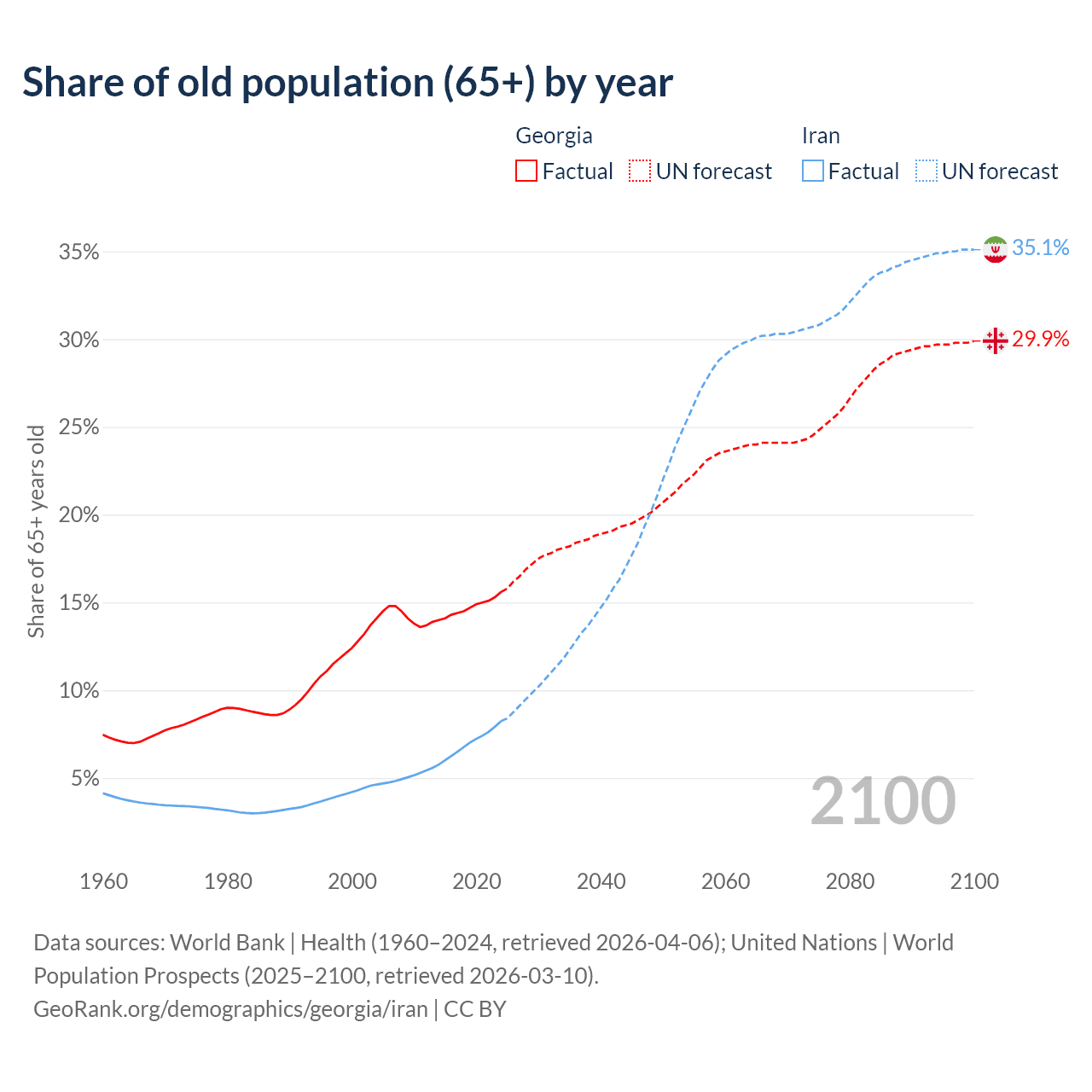 The share of older people aged 65 and over is 15.6% in Georgia and 8.24% in Iran. Life expectancy in Georgia compared to Iran .