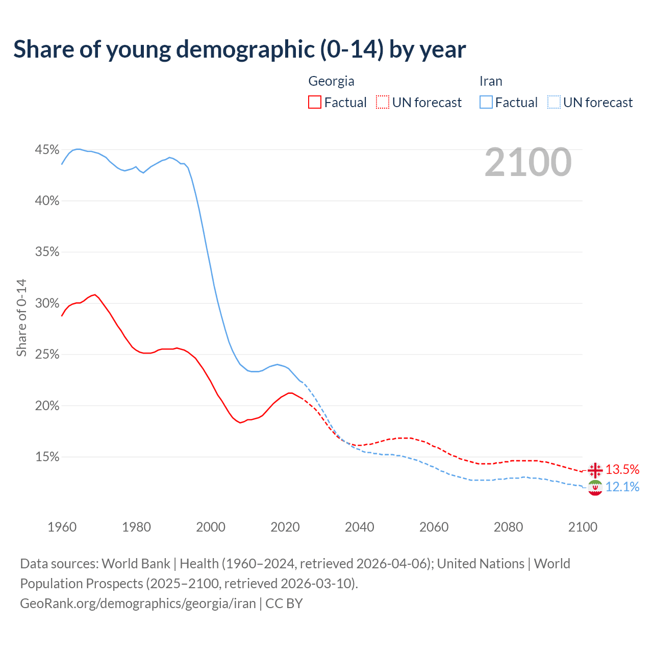 - The share of young demographic (0-15 years old) in Georgia is 20.8% vs 22.4% in Iran.