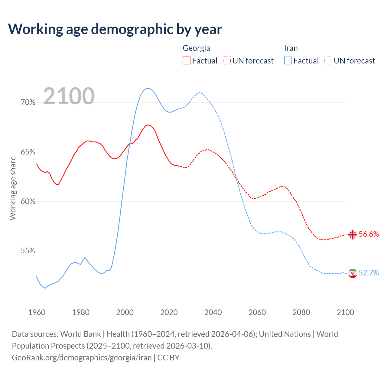 - Georgia has 2.35M working age adults (aged 15-64) vs 64.8M in Iran.
