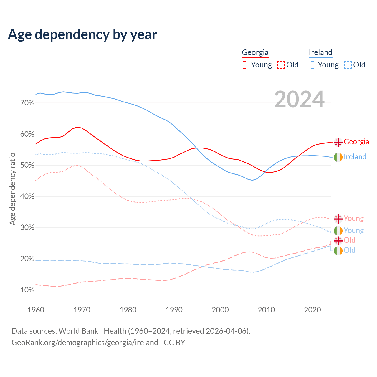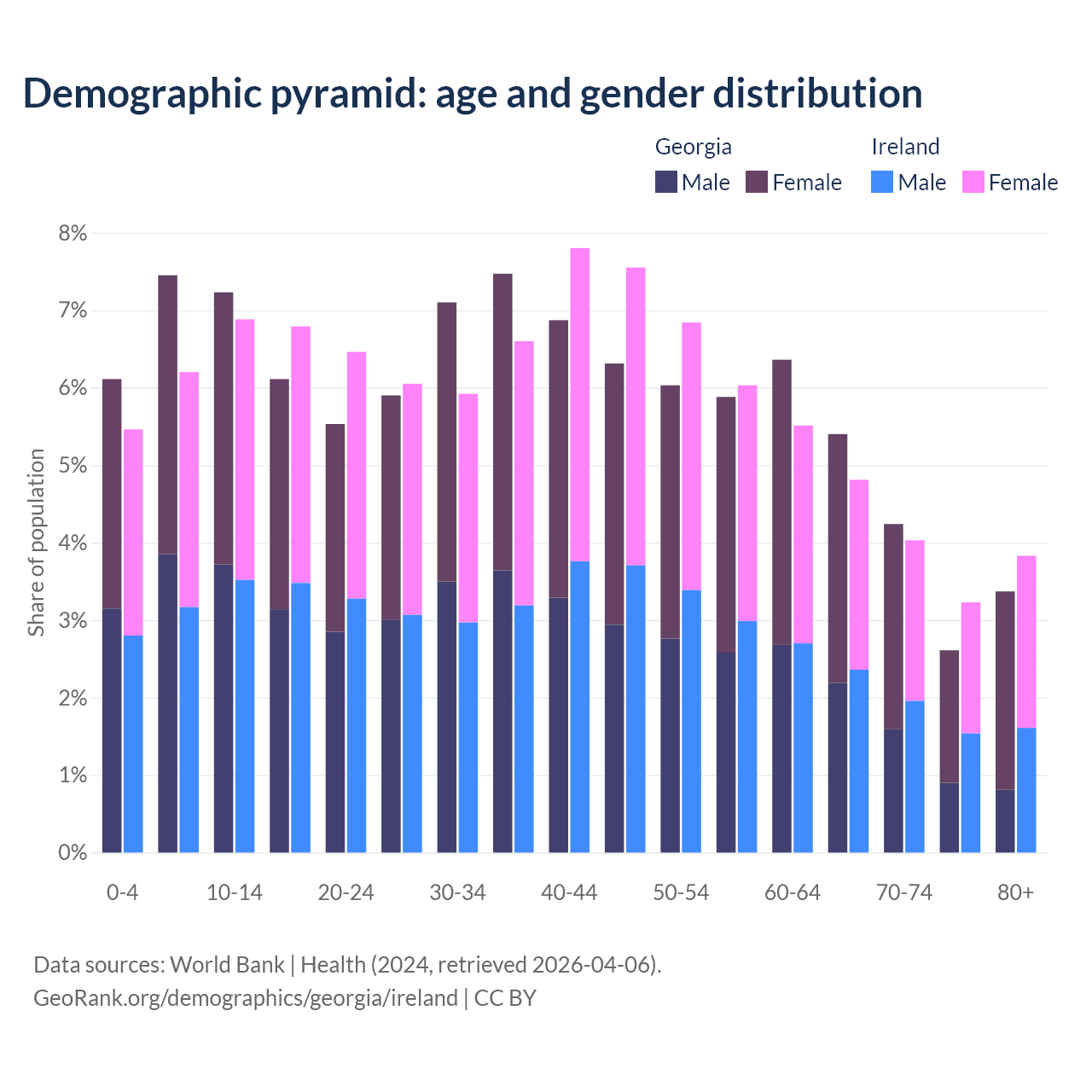 - Georgia is ranked 59/196 by median age (oldest to youngest) vs 48/196 for Ireland.