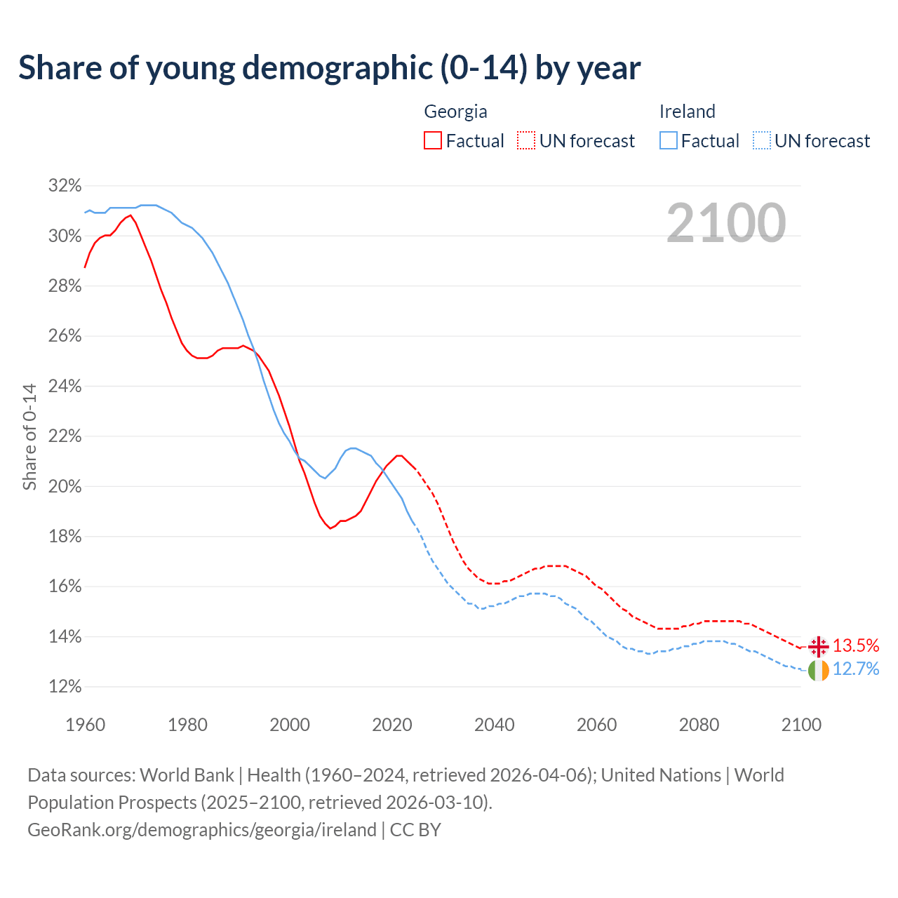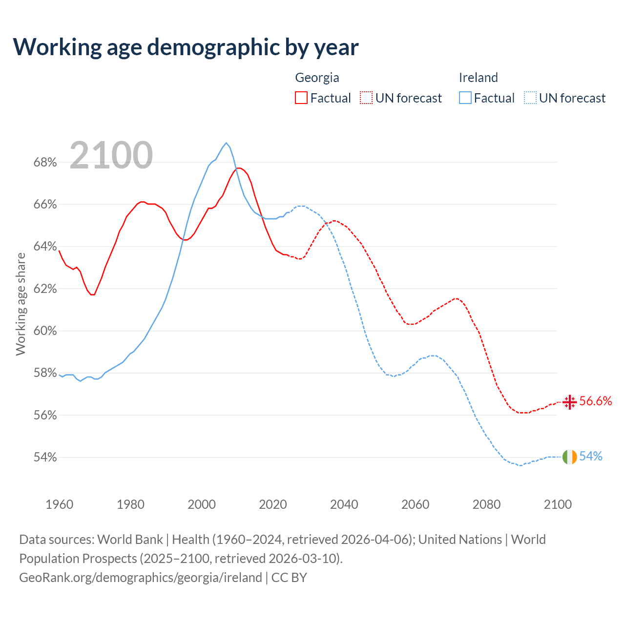 Median age Georgia vs Ireland, 1960-2100