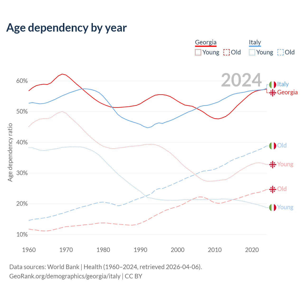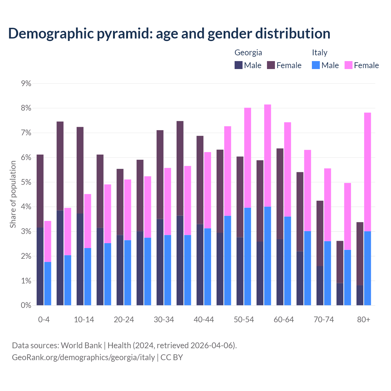 - Georgia is ranked 59/196 by median age (oldest to youngest) vs 4/196 for Italy.
