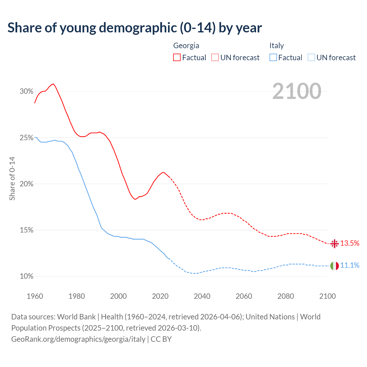 - The share of young demographic (0-15 years old) in Georgia is 20.8% vs 11.9% in Italy.
