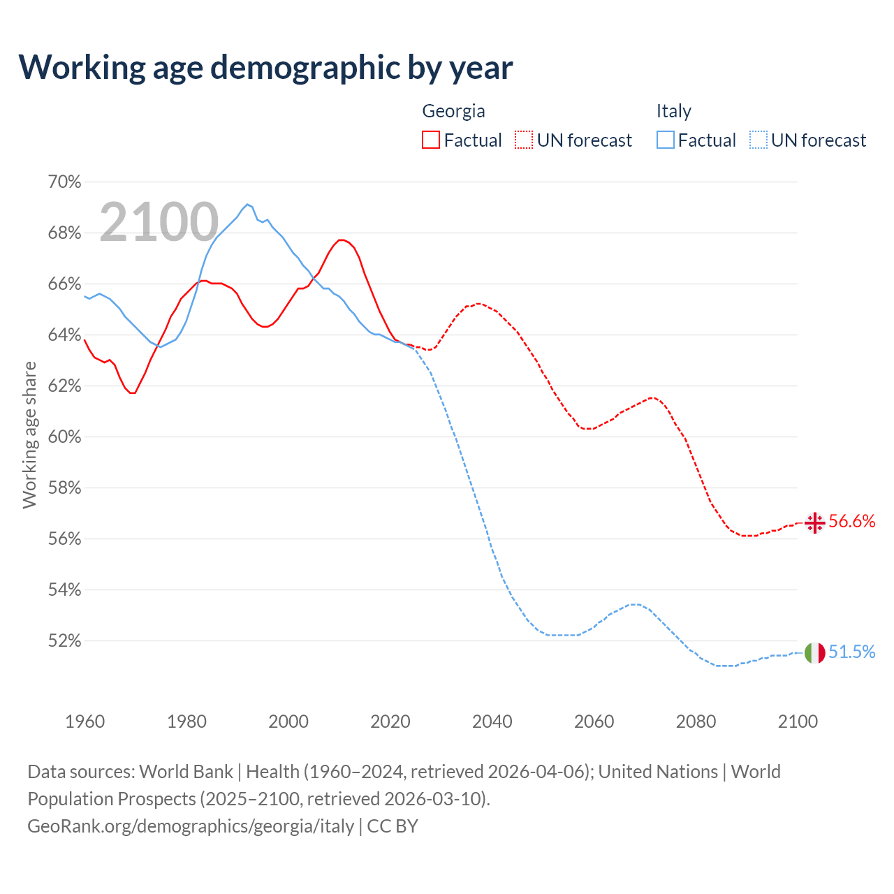 Median age Georgia vs Italy, 1960-2100