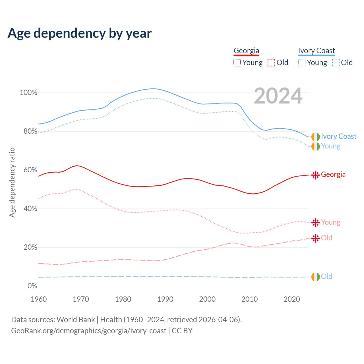 - Georgia is ranked 59/196 by median age (oldest to youngest) vs 175/196 for Ivory Coast.