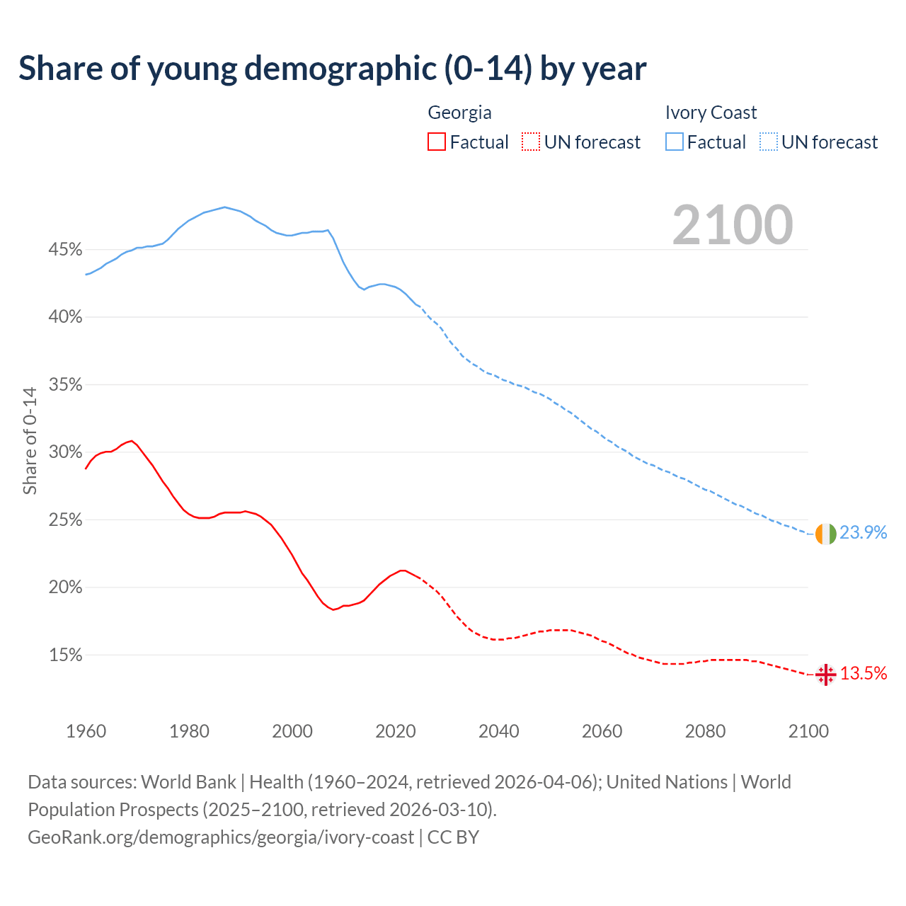 - The share of young demographic (0-15 years old) in Georgia is 20.8% vs 40.9% in Ivory Coast.
