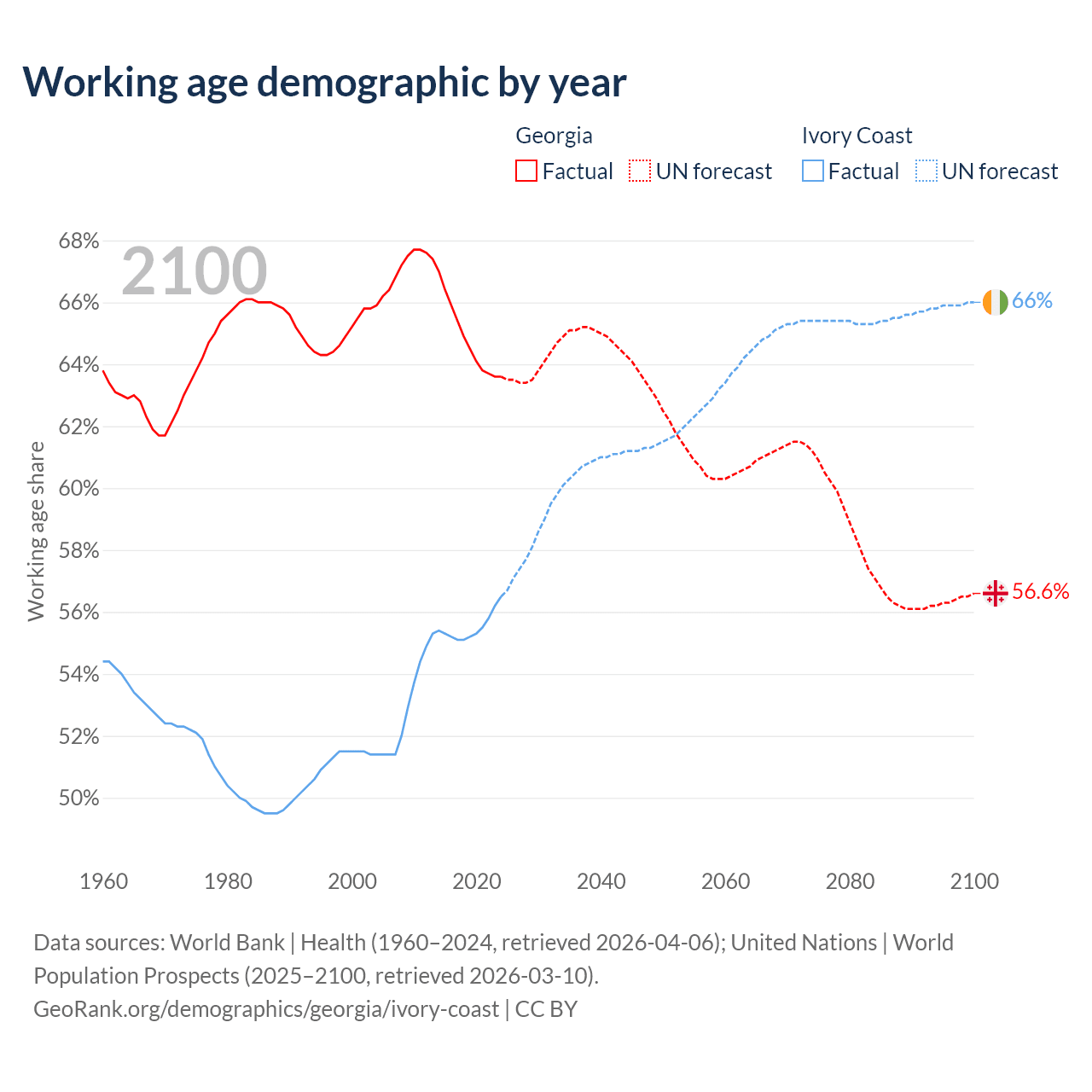 - Georgia has 2.35M working age adults (aged 15-64) vs 19.1M in Ivory Coast.