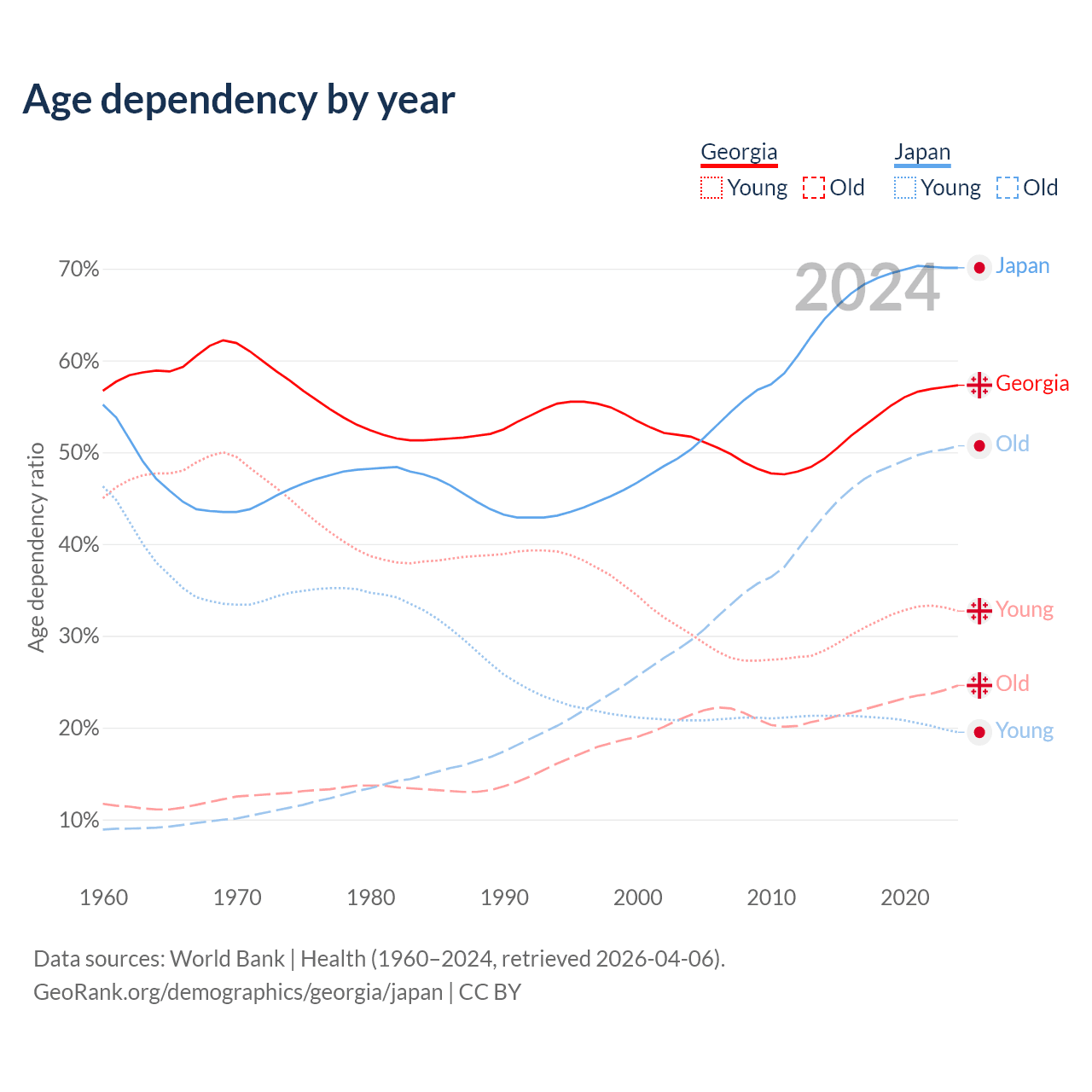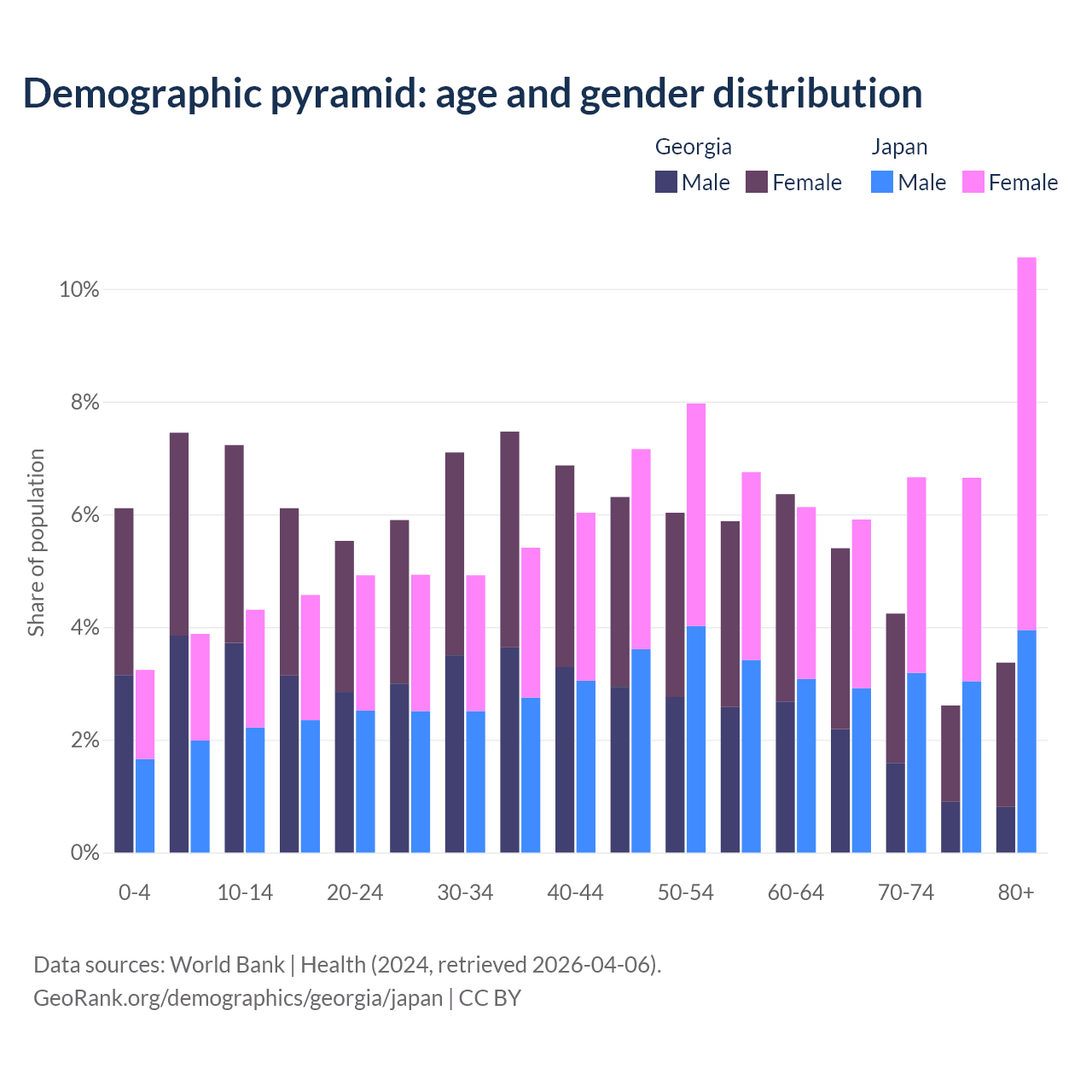 - Georgia is ranked 59/196 by median age (oldest to youngest) vs 2/196 for Japan.