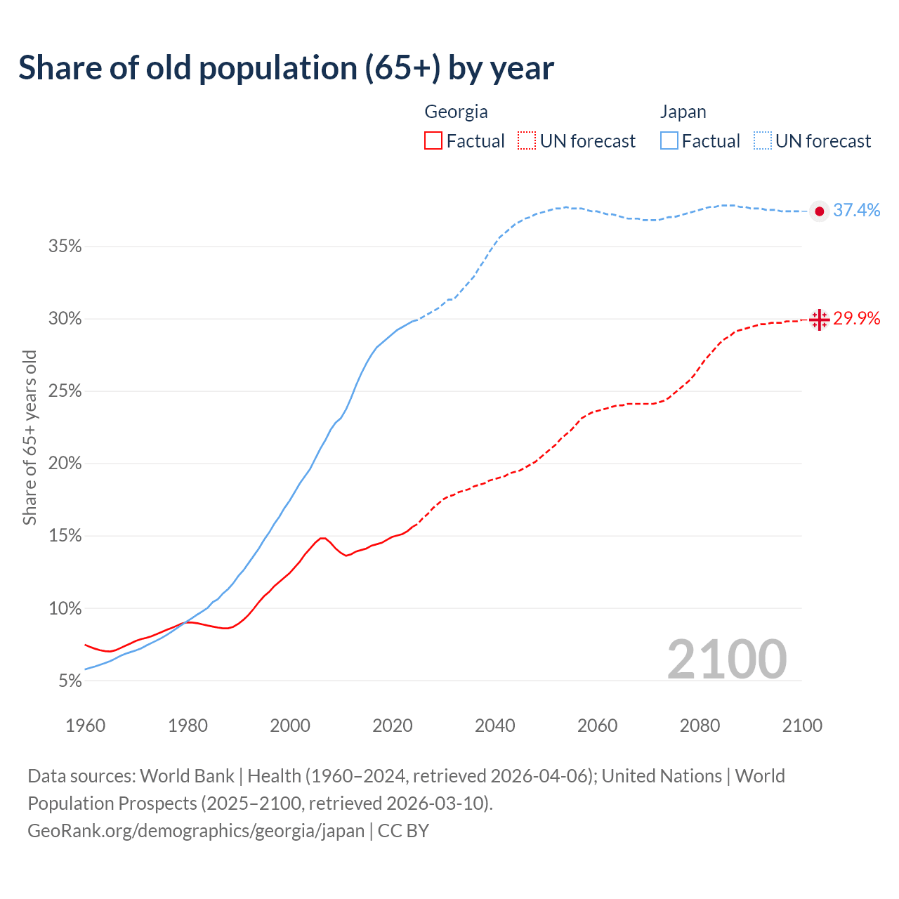 The share of older people aged 65 and over is 15.6% in Georgia and 29.8% in Japan. Life expectancy in Georgia compared to Japan .