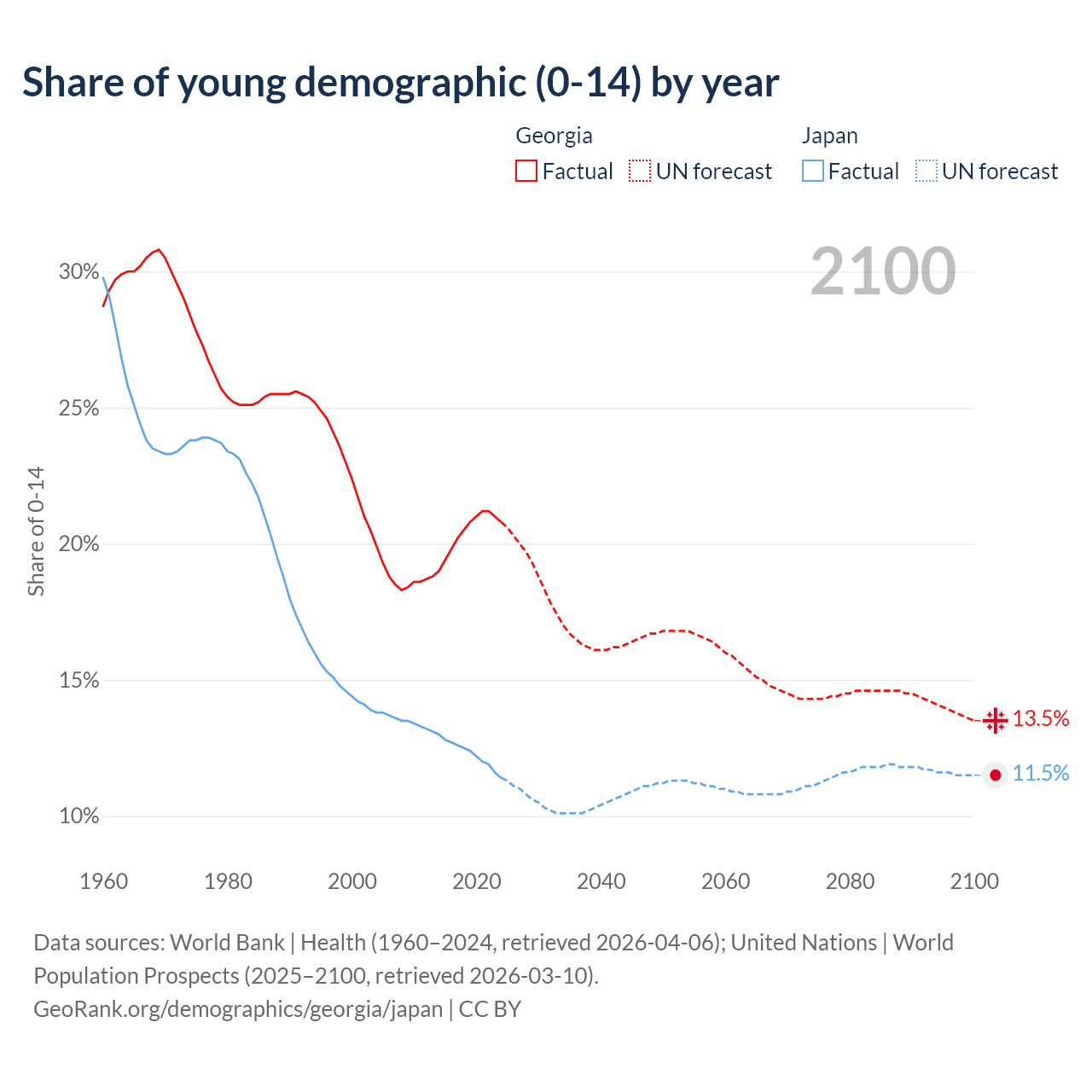- The share of young demographic (0-15 years old) in Georgia is 20.8% vs 11.4% in Japan.