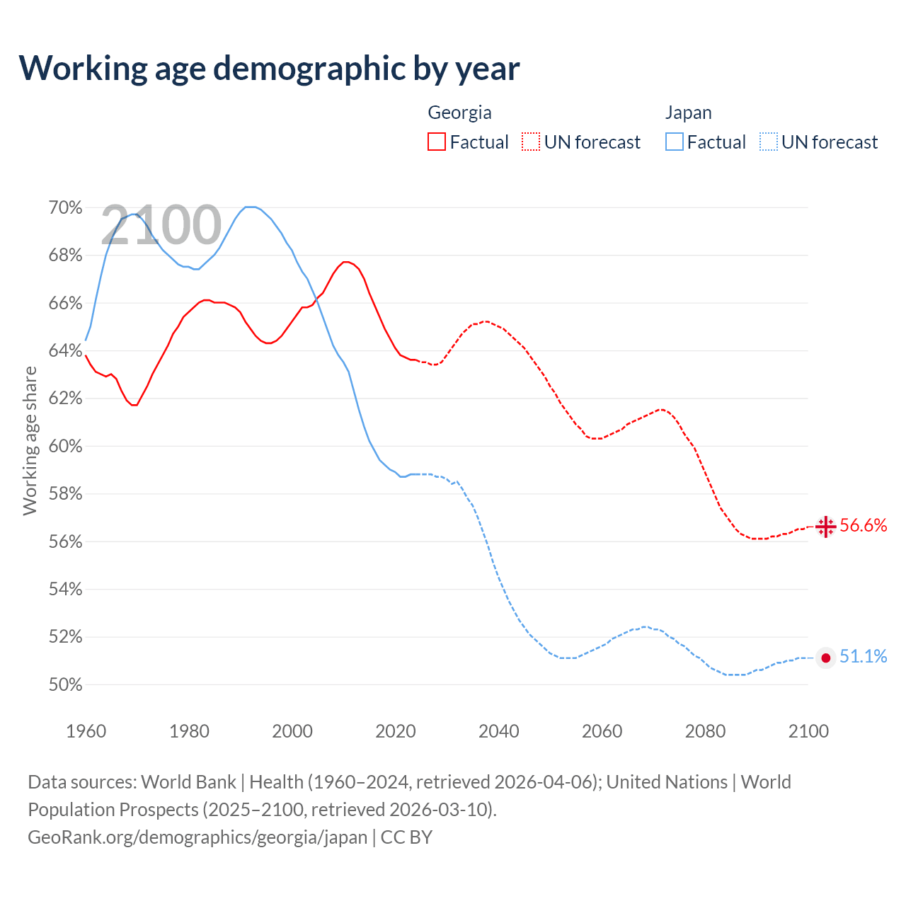 - Georgia has 2.35M working age adults (aged 15-64) vs 72.1M in Japan.