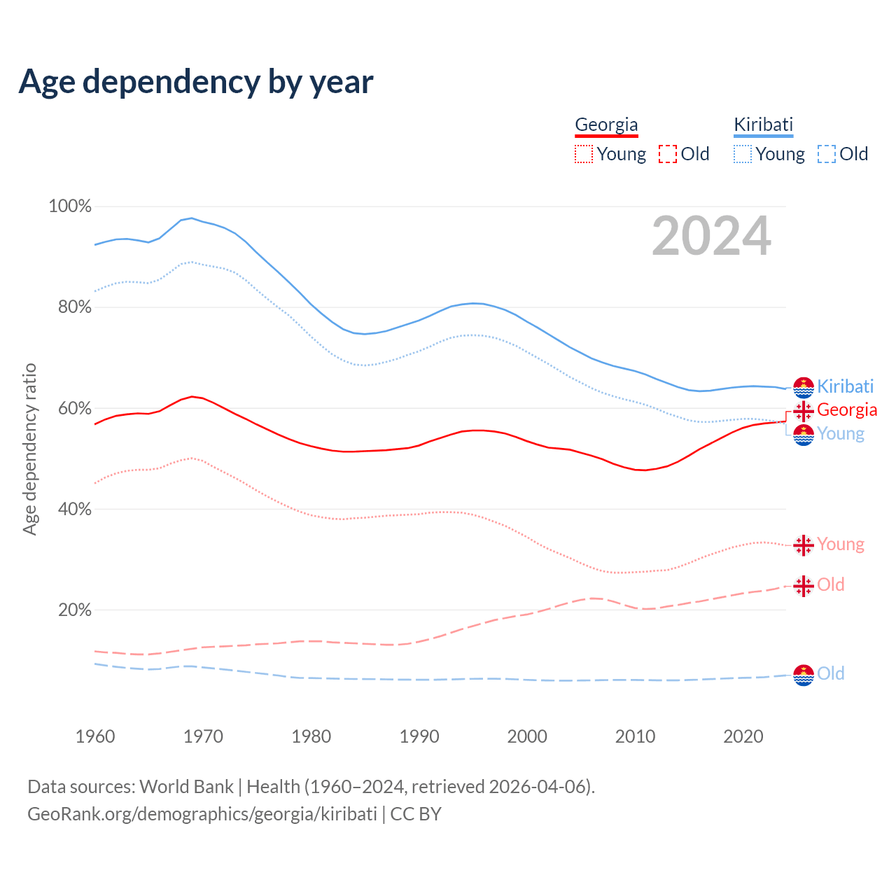 - The share of old-age demographic (65+) in Georgia is 15.6% vs 4.24% in Kiribati.