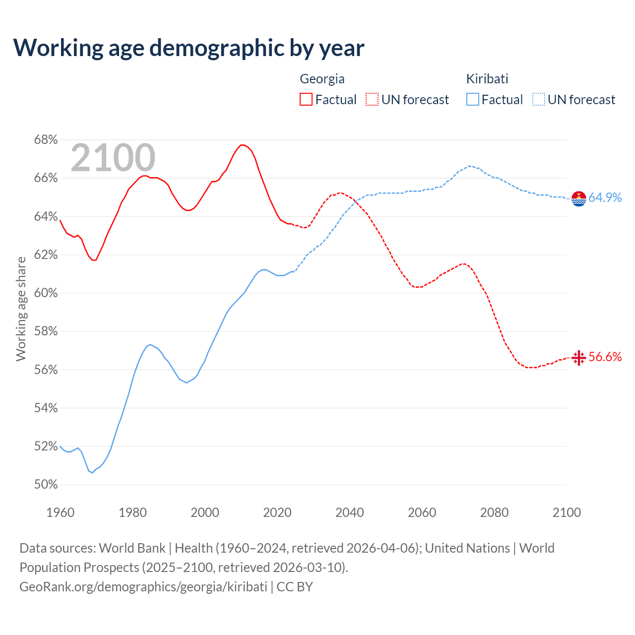 Median age Georgia vs Kiribati, 1960-2100