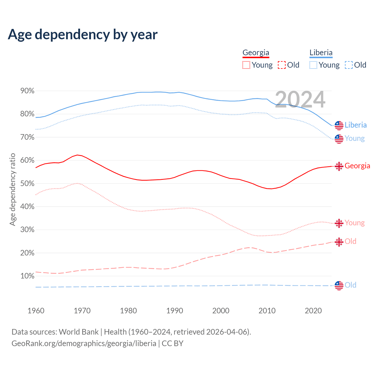 - The share of old-age demographic (65+) in Georgia is 15.6% vs 3.3% in Liberia.