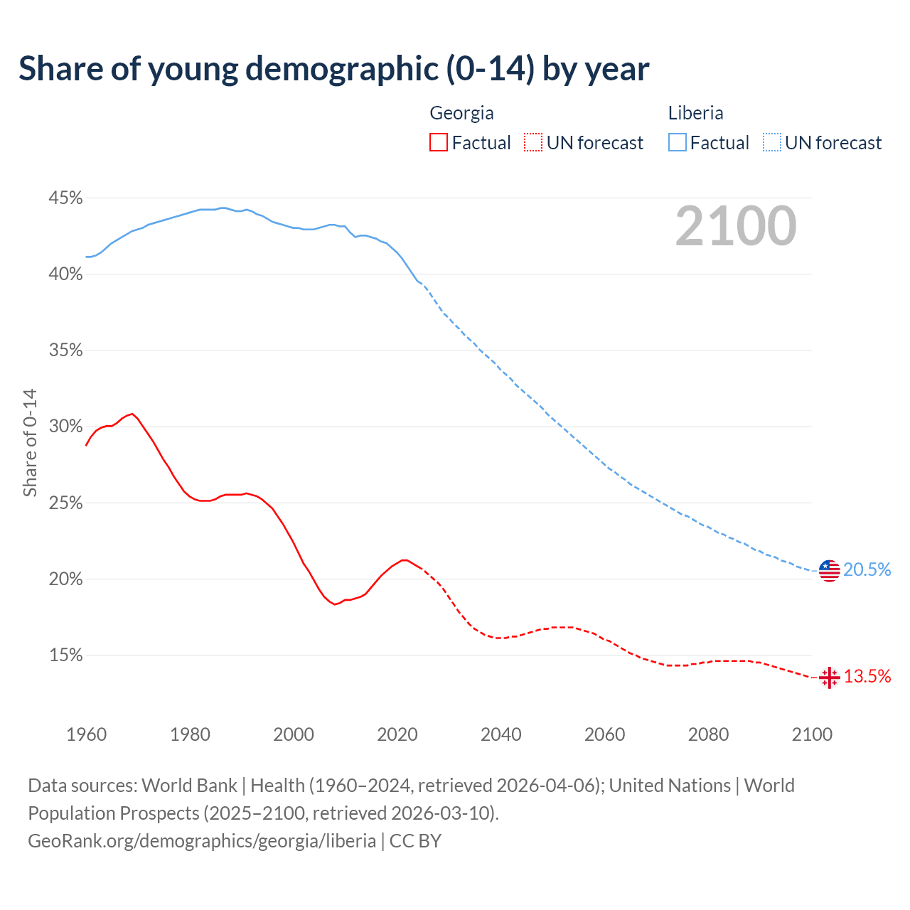 - The share of young demographic (0-15 years old) in Georgia is 20.8% vs 39.5% in Liberia.