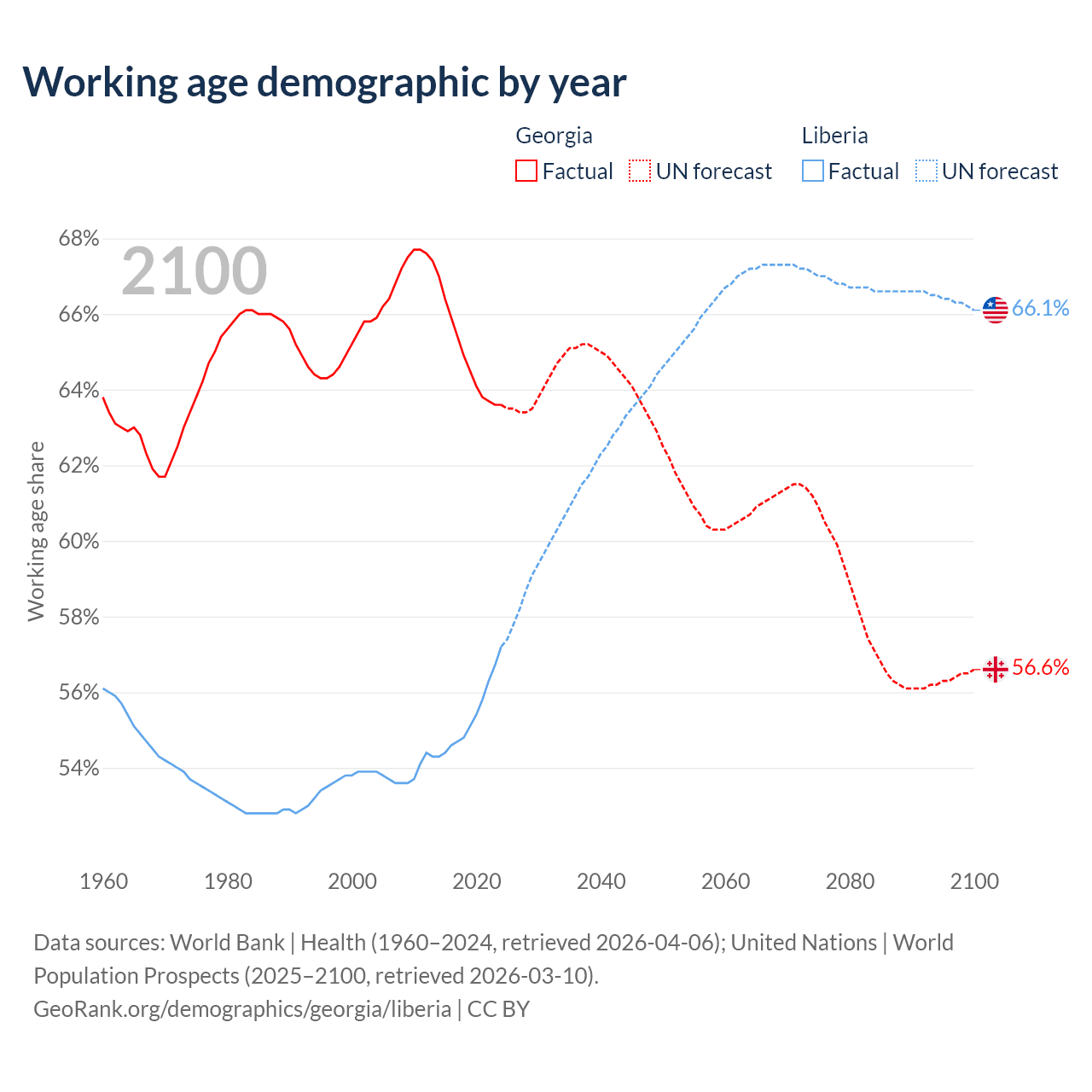 Median age Georgia vs Liberia, 1960-2100