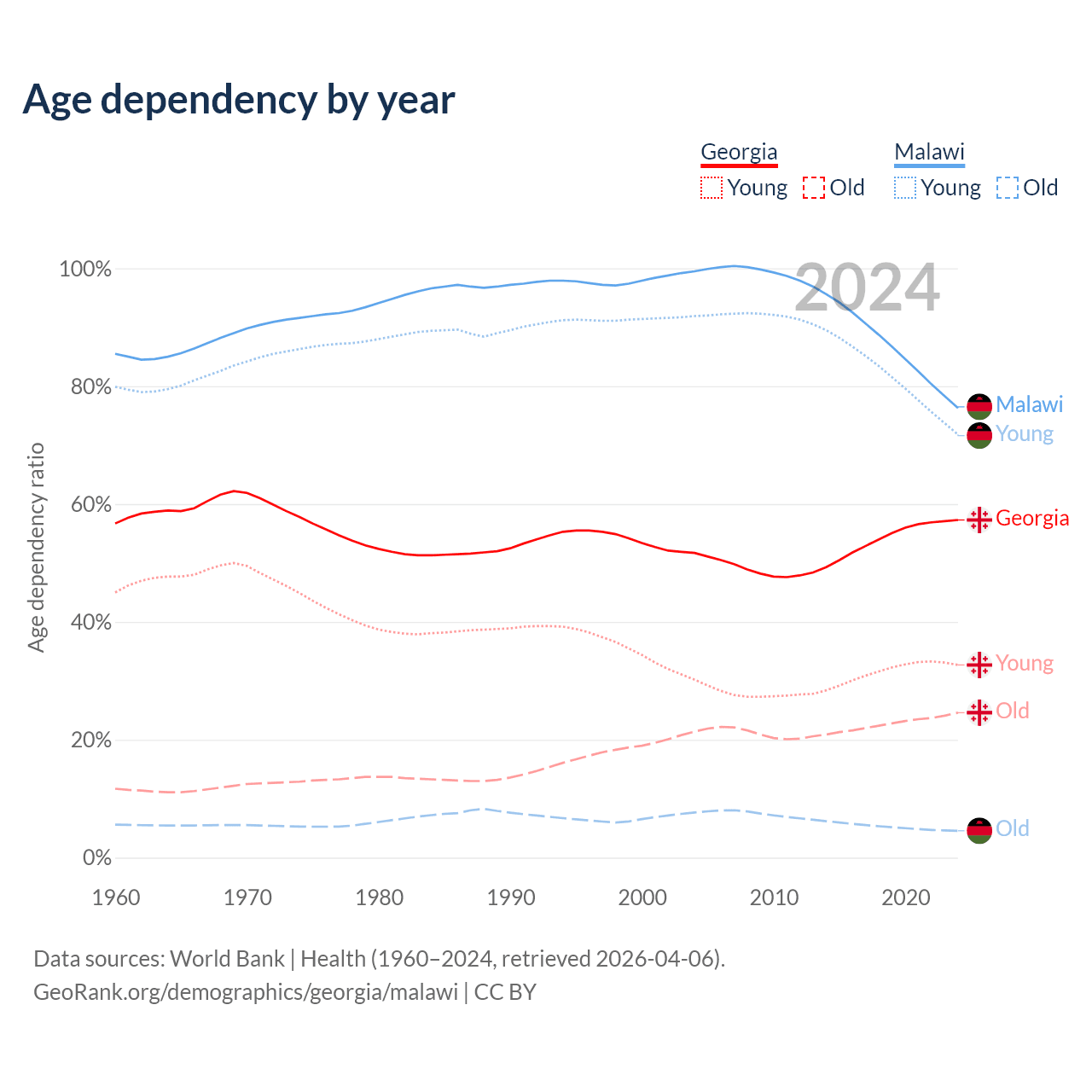 - The share of old-age demographic (65+) in Georgia is 15.6% vs 2.59% in Malawi.