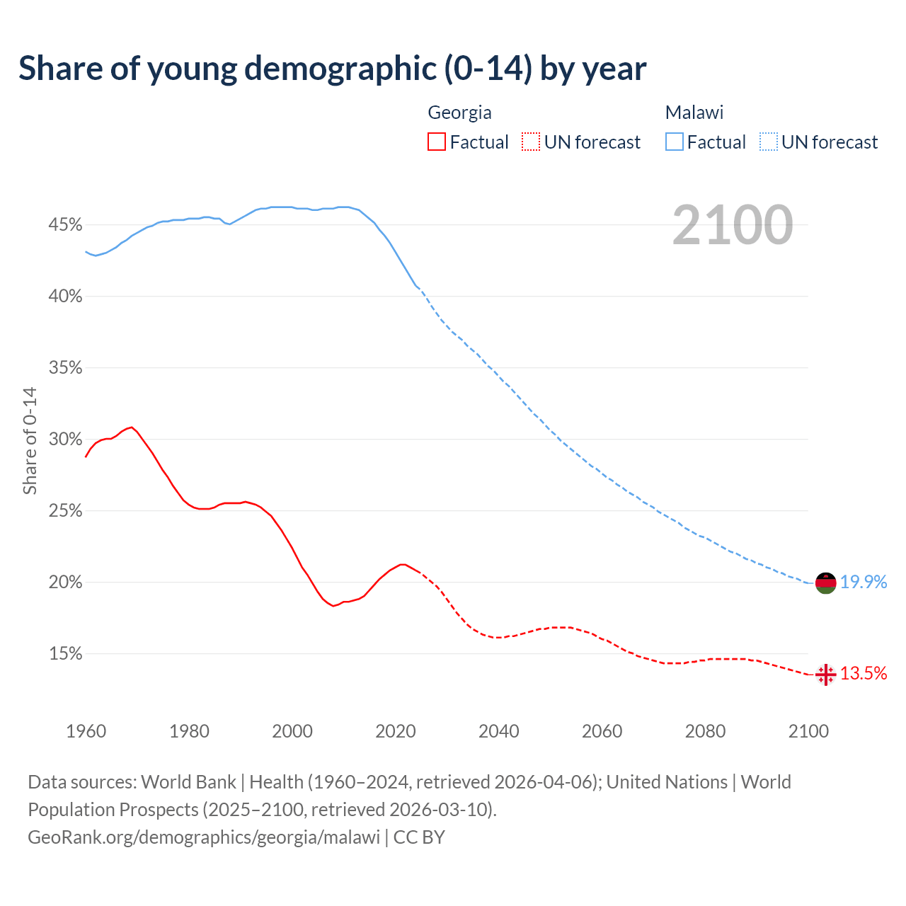 - The share of young demographic (0-15 years old) in Georgia is 20.8% vs 40.7% in Malawi.