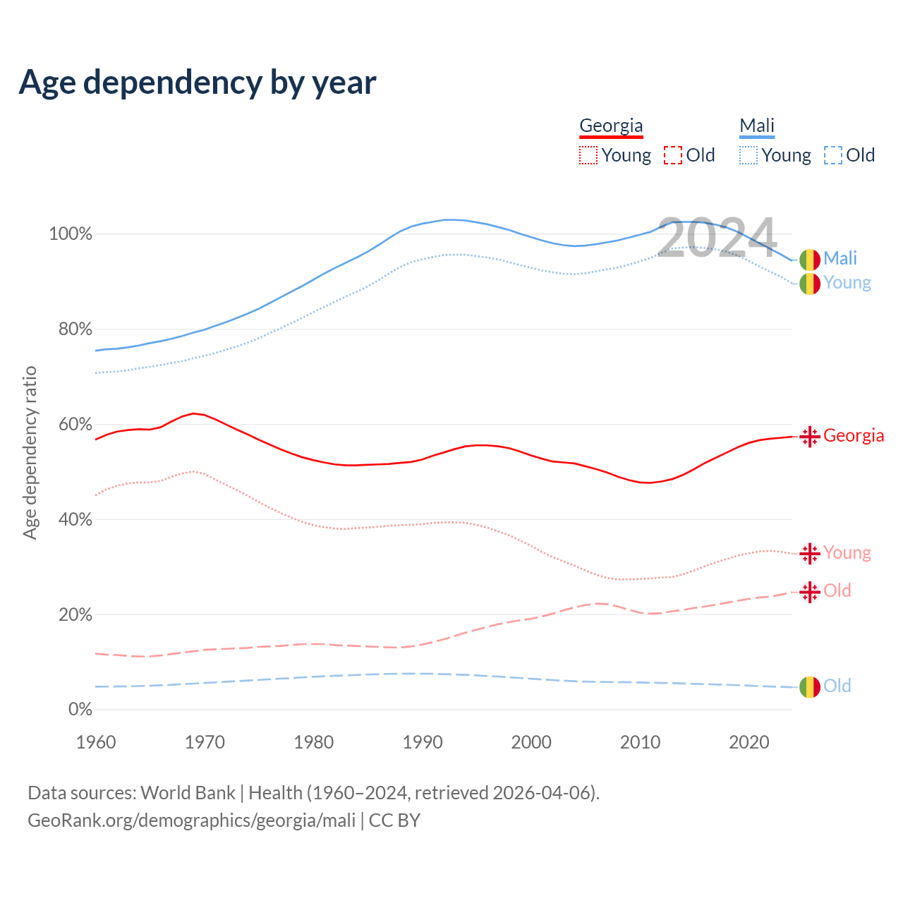 - Georgia is ranked 59/196 by median age (oldest to youngest) vs 193/196 for Mali.