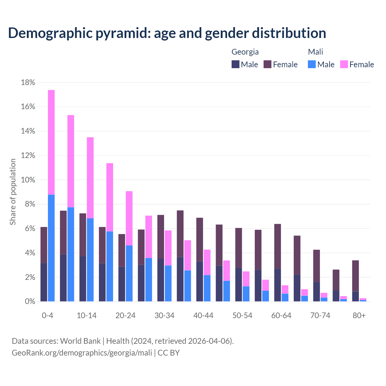 - As of 2026, the population of Georgia is 3.7M vs 26.1M in Mali - 7.07 times difference.