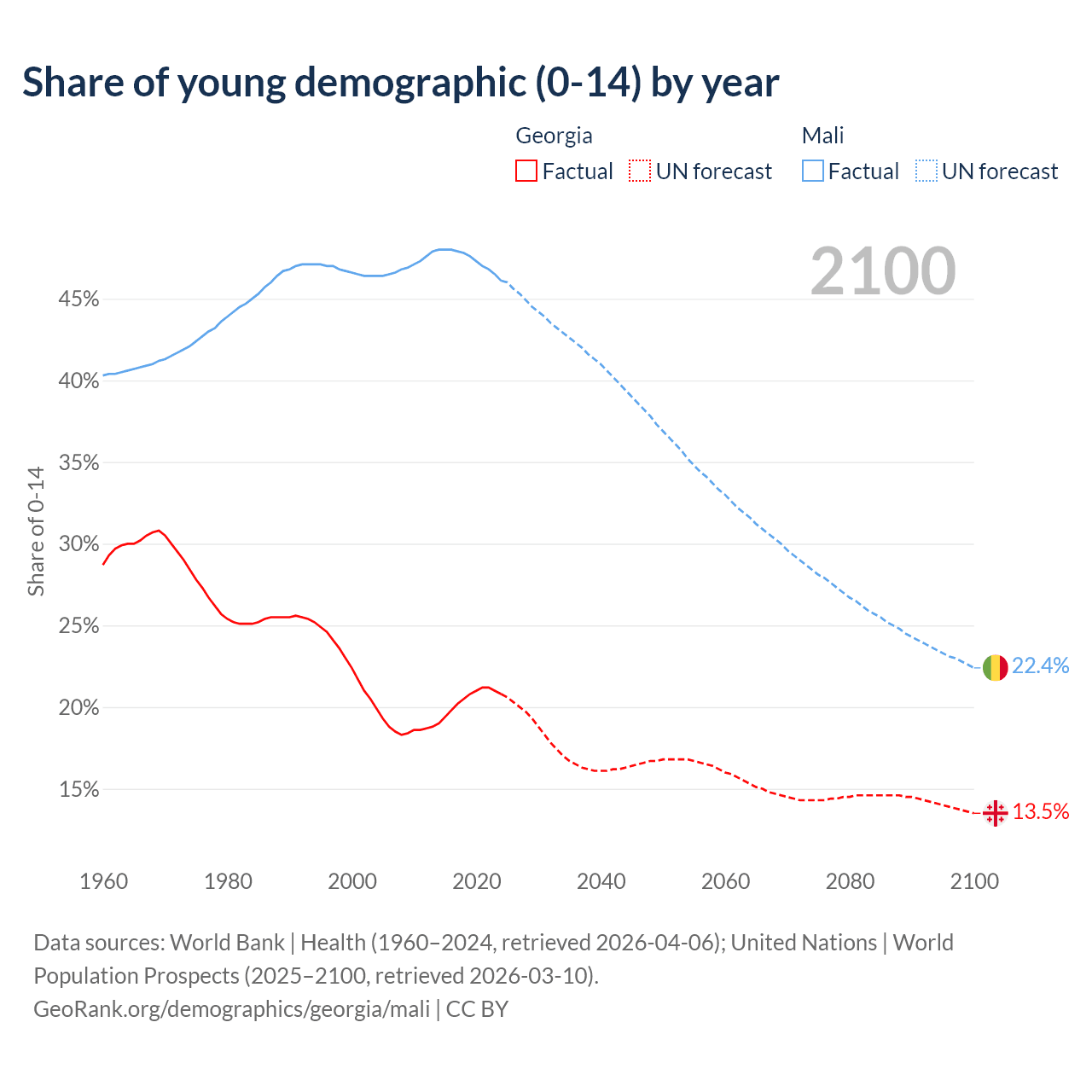- The share of young demographic (0-15 years old) in Georgia is 20.8% vs 46.1% in Mali.