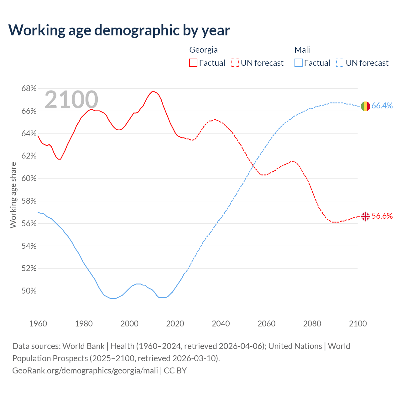 - Georgia has 2.35M working age adults (aged 15-64) vs 13.5M in Mali.